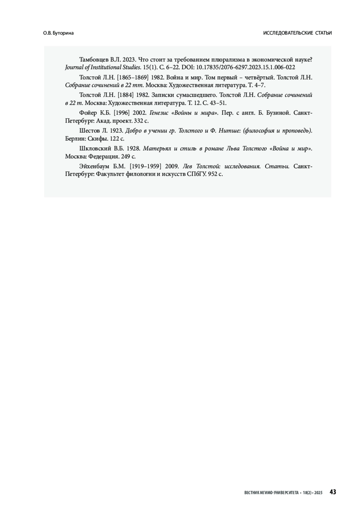 43. Плеханов Г.В. 1923. Статьи о Л. Толстом. Москва: Государственное издательство. 97 с. Полтавец Е.Ю. 2017. Потлач и кенозис как ритуальный код русской художественной историософии (в произведениях А.С. Пушкина и Л.Н. Толстого). Евгений Александрович Маймин и его время: Материалы Международной научной конференции, Псков, 22-24 октября 2015 г. Псков: Псковский государственный университет. С. 123-127.