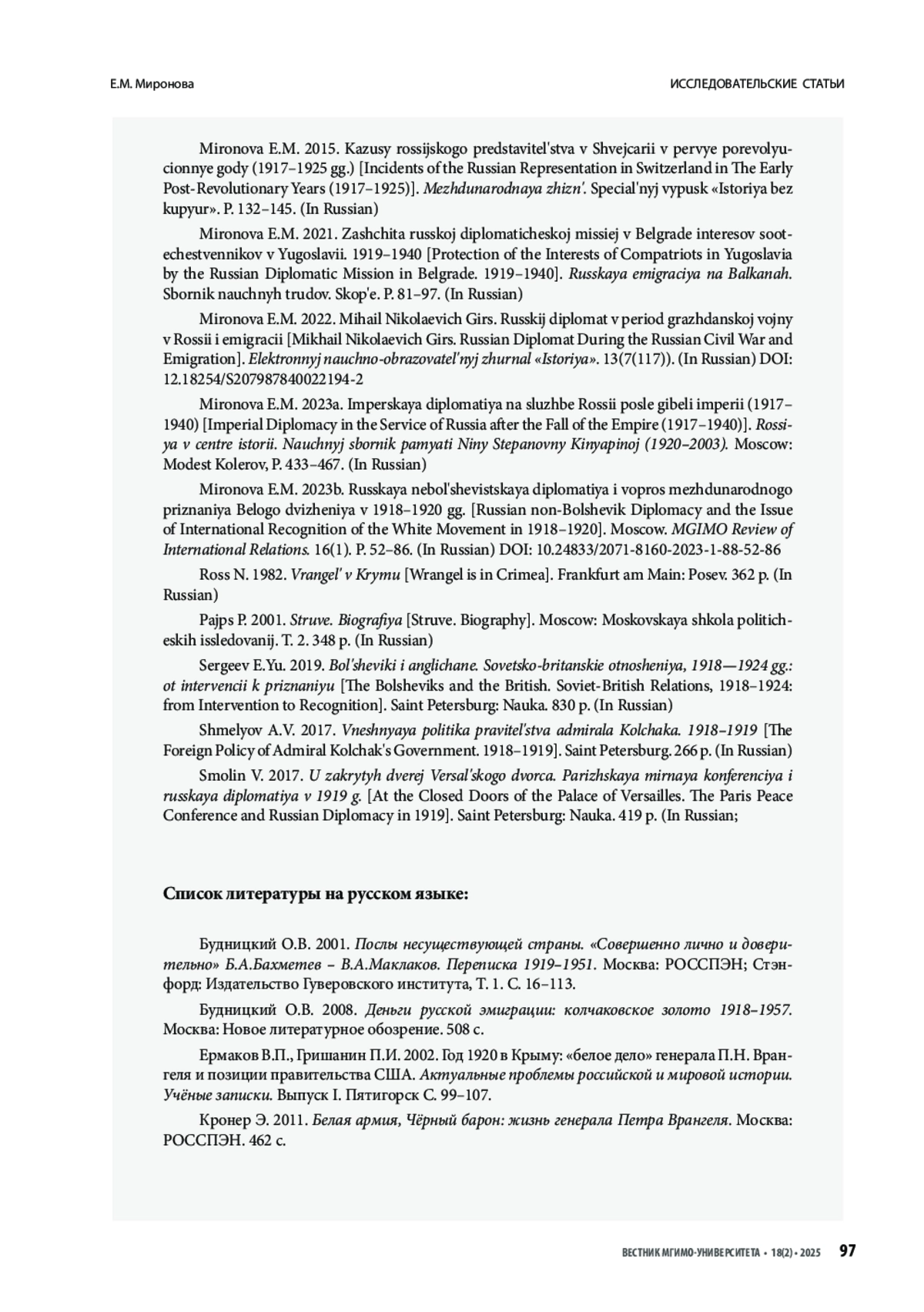 В статье на основе обширного источникового материала представлен сложный период деятельности Заграничного дипломатического корпуса Белого движения. В условиях поражений, которые терпели белые в России, их внешнеполитическое представительство продолжало работать. Более того, руководство Корпуса приняло решение о том, что для его учреждений не только подчинение органам Советской власти невозможно, но недопустима и передача дел дипломатическим представительствам Москвы. Был взят курс на продолжение самостоятельного и независимого существования Корпуса в случае поражения белых в Гражданской войне. Предпринимались усилия по восстановлению в дипломатической структуре иерархии и дисциплины. Был сокращён личный состав, но сохранена репрезентативность учреждений Корпуса в мире. Велась работа по обеспечению финансирования его дальнейшей деятельности. Ведомство продолжало повседневную работу, в которой выделились и усиливались новые направления. Оно активно оказывало помощь растущему количеству русских беженцев, искало пути сохранения русского имущества за рубежом. Руководство структуры начало разрабатывать вопрос о правовой защите покинувших родину соотечественников на случай поражения Белого движения. Приход к власти в Крыму генерала барона Врангеля был неоднозначно встречен русским обществом за рубежом. Возглавлявший дипломатическое ведомство с января 1919 г. С. Д. Сазонов проявил полную лояльность по отношению к созданному в Севастополе правительству. Тем не менее Врангель отправил его в отставку, передав управление внешней политикой П. Б. Струве. Однако С. Д. Сазонов успел подготовить позиции для старейшины Корпуса – посла в Риме М. Н. Гирса, который и возглавил Корпус после отставки Сазонова. П. Б. Струве разделил с ним руководство и ответственность. Корпус укрепил свои независимые позиции и вошёл в последний этап противостояния с большевиками как партнёр, а не подчинённая центру структура, что дало ему перспективу продолжения работы после окончания Гражданской войны на Родине.