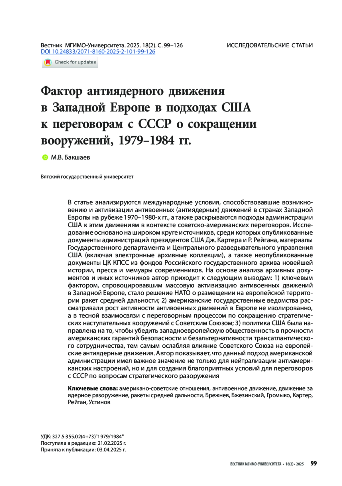 37. Михайленко В.И. 2013. Уроки «кризиса евроракет» 1970-1980-х гг. Tempus et Memoria. 8(2). С. 135-143.