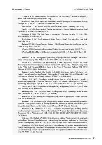14. Kanet R.E. 2019. Russian Strategic Culture, Domestic Politics and Cold War 2.0. European Politics and Society. 20(2). P. 190-206. https://doi.org/10.1080/23745118.2018.1545184.