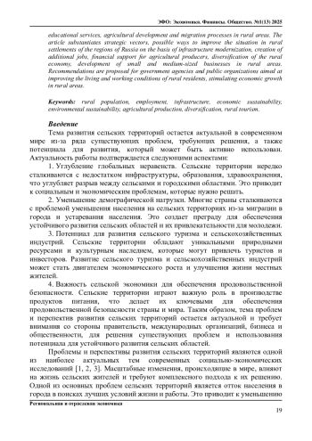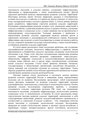 В статье приведены результаты исследований жизнеобеспечения сельских территорий, состояния сельской экономики и инфраструктуры в отдельных регионах России по принципу социо-эколого-экономических оценок, выявлены основные проблемы, с которыми сталкиваются жители сельских районов. Основное внимание уделено недостаточной инфраструктуре, обеспеченности медицинскими и образовательными услугами, развитию сельского хозяйства и миграционным процессам в сельской местности. В статье обоснованы стратегические векторы, возможные пути улучшения ситуации в сельских поселениях регионов России на основе модернизации инфраструктуры, создания дополнительных рабочих мест, финансовой поддержки сельхозпроизводителей, диверсификации сельской экономики, развития малого и среднего бизнеса в сельских районах. Предложены рекомендации для государственных органов и общественных организаций, направленные на улучшение условий жизни и труда жителей сельских районов, стимулирование экономического роста в сельской местности.