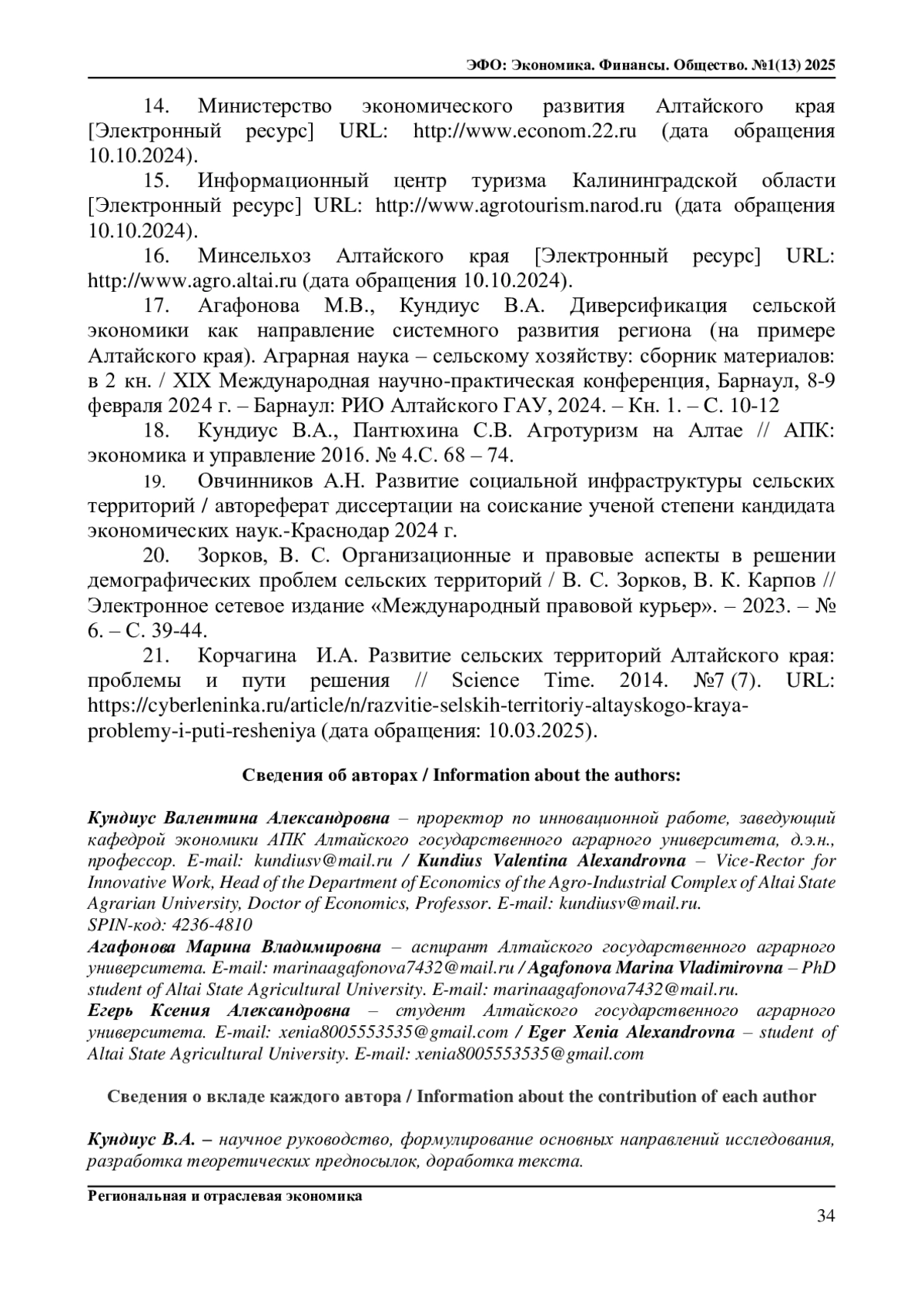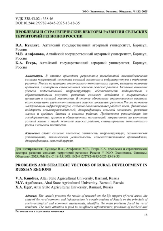 17. Агафонова М.В., Кундиус В.А. Диверсификация сельской экономики как направление системного развития региона (на примере Алтайского края). Аграрная наука - сельскому хозяйству: сборник материалов: в 2 кн. / XIX Международная научно-практическая конференция, Барнаул, 8-9 февраля 2024 г. - Барнаул: РИО Алтайского ГАУ, 2024. - Кн. 1. - C. 10-12.