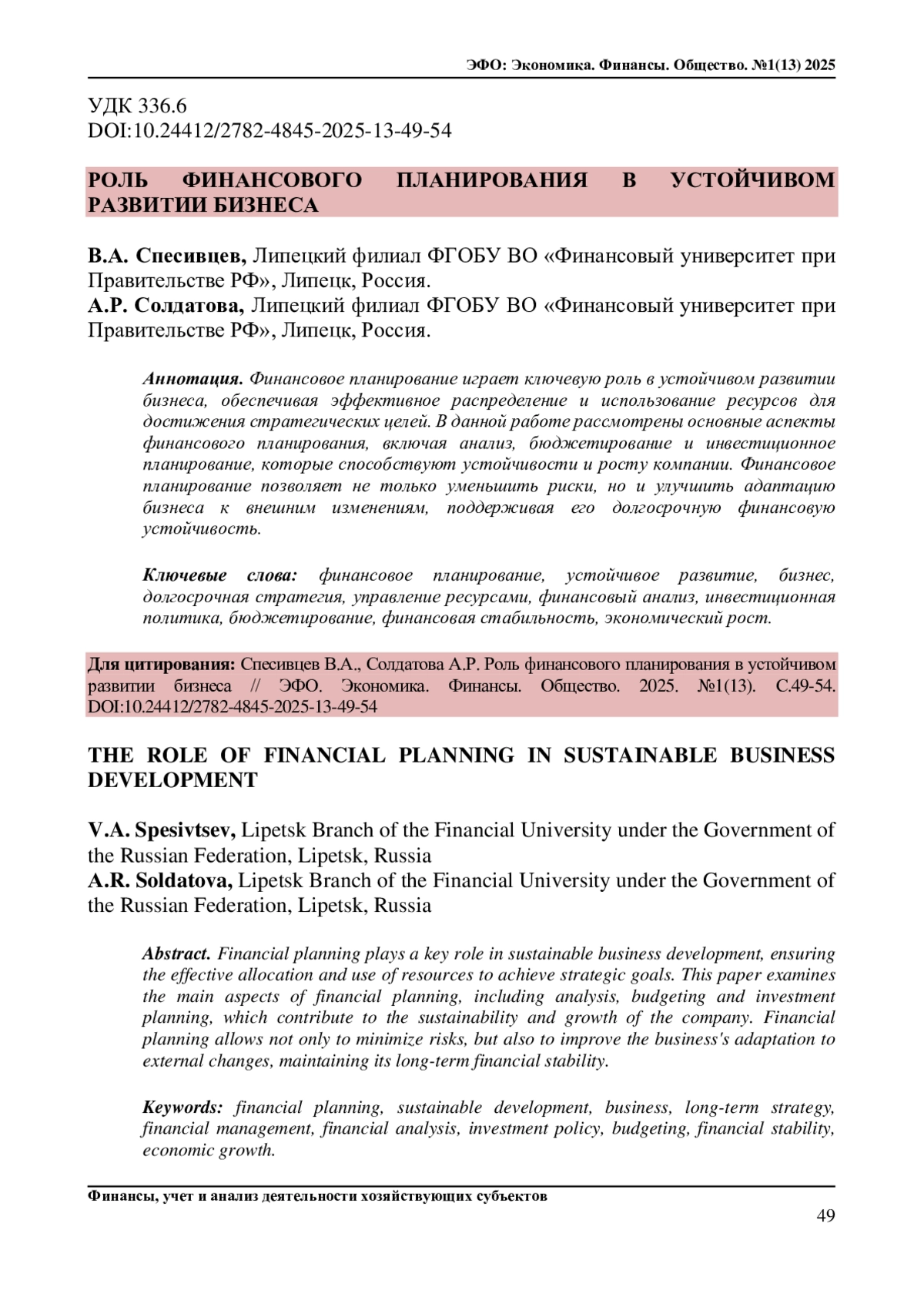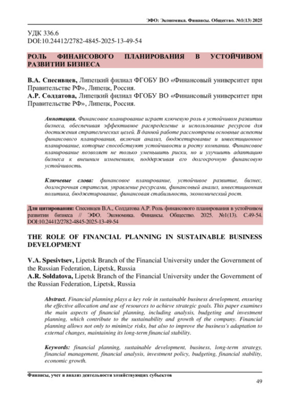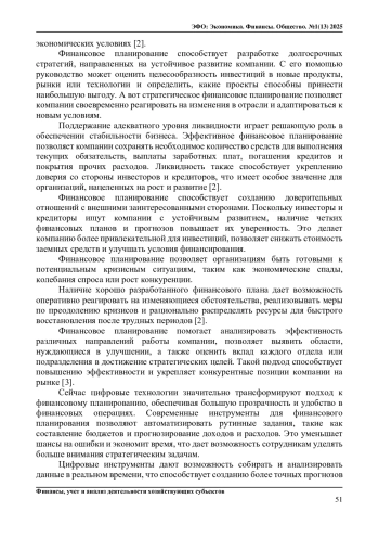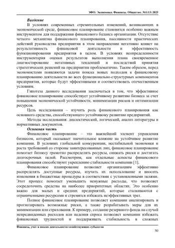 Финансовое планирование играет ключевую роль в устойчивом развитии бизнеса, обеспечивая эффективное распределение и использование ресурсов для достижения стратегических целей. В данной работе рассмотрены основные аспекты финансового планирования, включая анализ, бюджетирование и инвестиционное планирование, которые способствуют устойчивости и росту компании. Финансовое планирование позволяет не только уменьшить риски, но и улучшить адаптацию бизнеса к внешним изменениям, поддерживая его долгосрочную финансовую устойчивость.