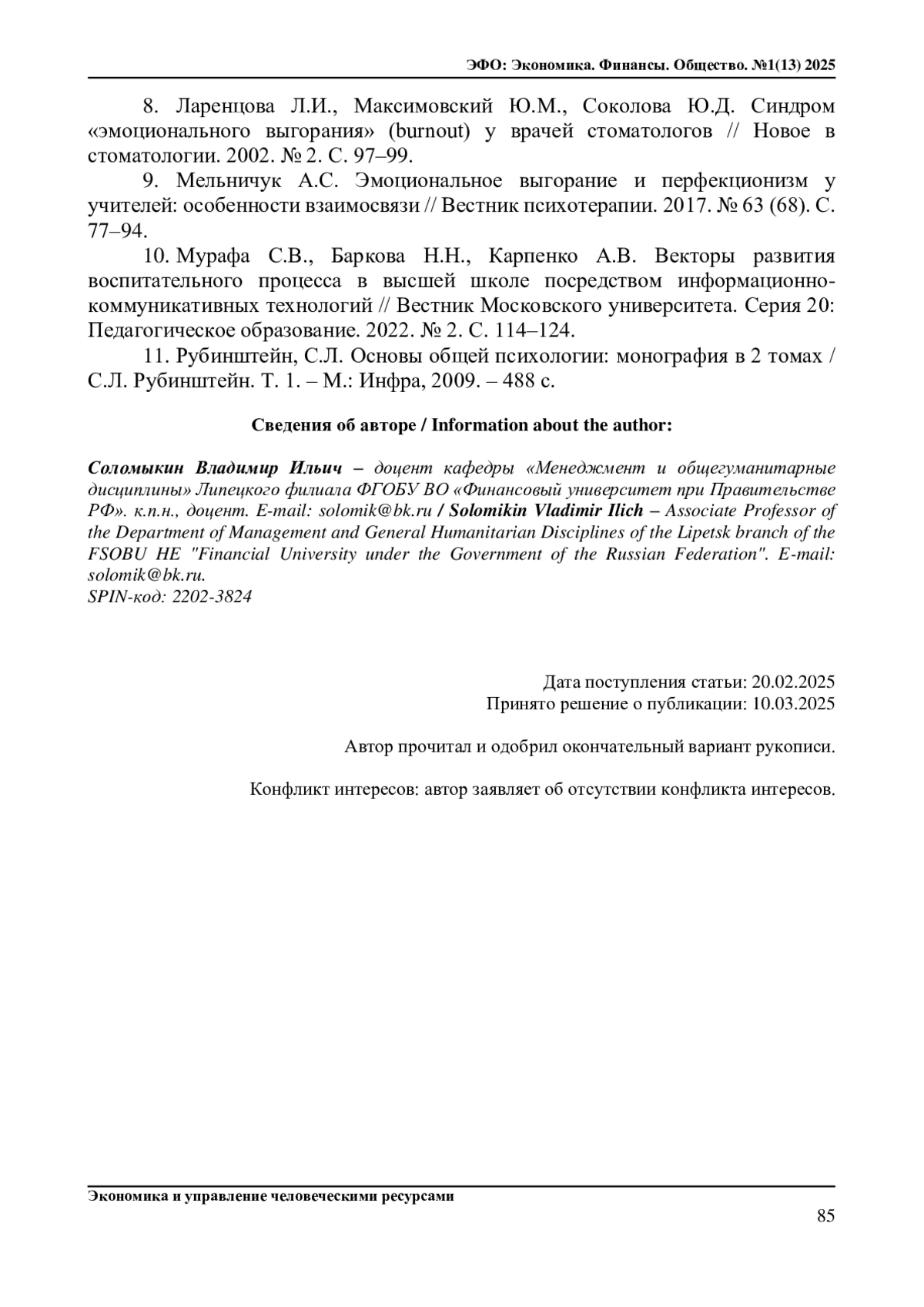 7. 	Ларенцова Л.И. Изучение синдрома эмоционального выгорания у врачей-стоматологов // Клиническая стоматология. 2003. № 4 (28). С. 82-86.