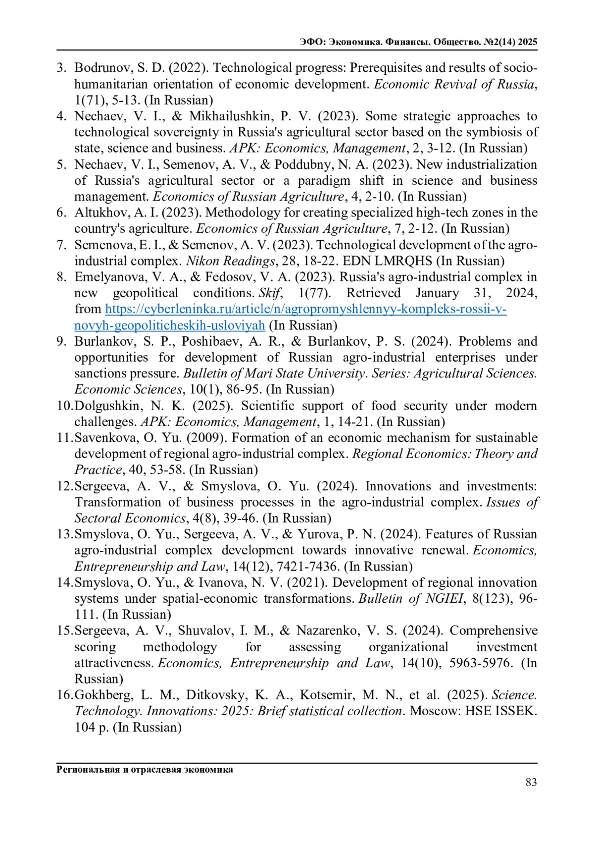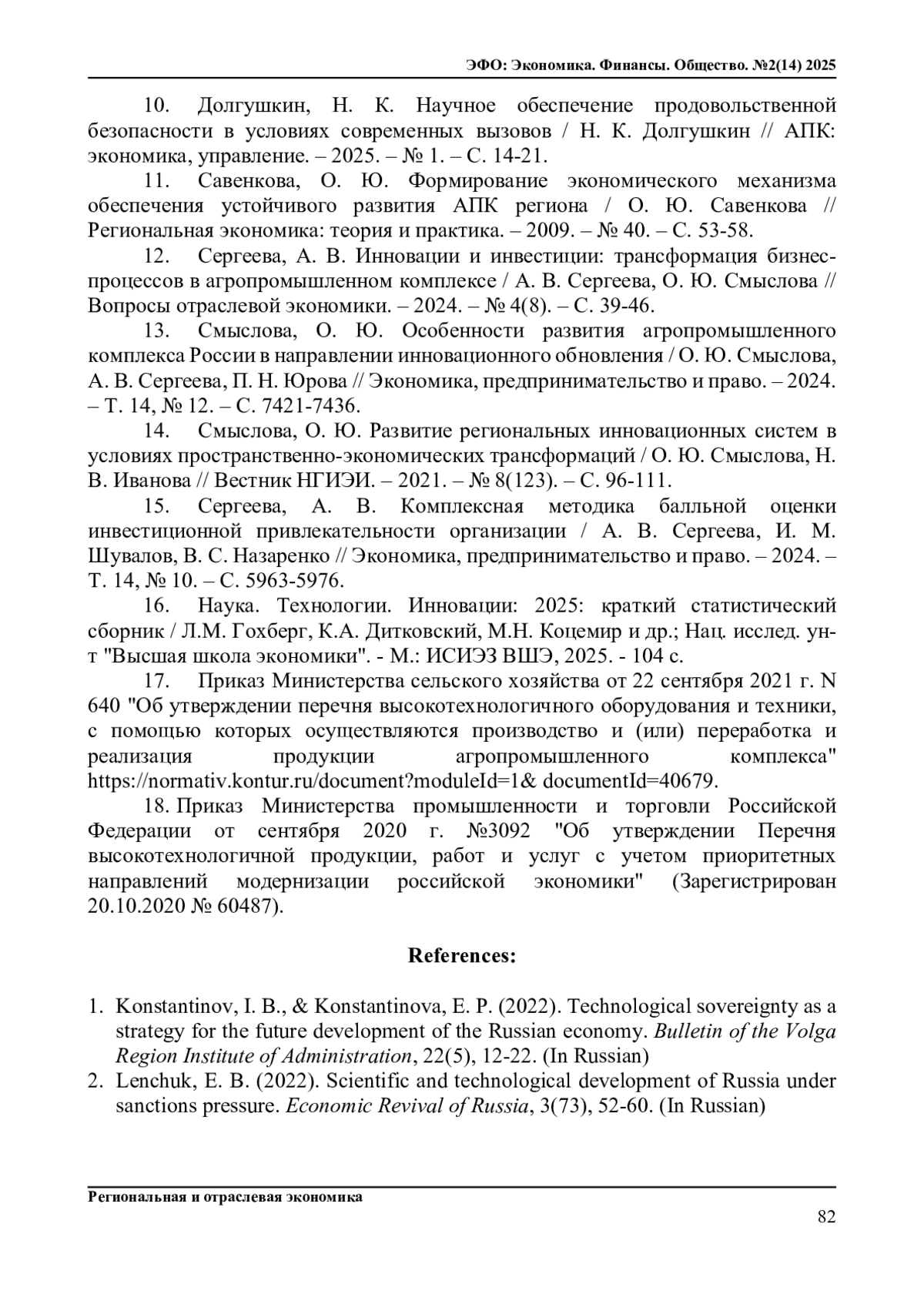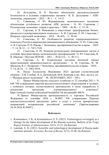 10. Долгушкин, Н. К. Научное обеспечение продовольственной безопасности в условиях современных вызовов / Н. К. Долгушкин // АПК: экономика, управление. - 2025. - № 1. - С. 14-21.