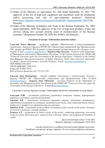 13. Смыслова, О. Ю. Особенности развития агропромышленного комплекса России в направлении инновационного обновления / О. Ю. Смыслова, А. В. Сергеева, П. Н. Юрова // Экономика, предпринимательство и право. - 2024. - Т. 14, № 12. - С. 7421-7436.