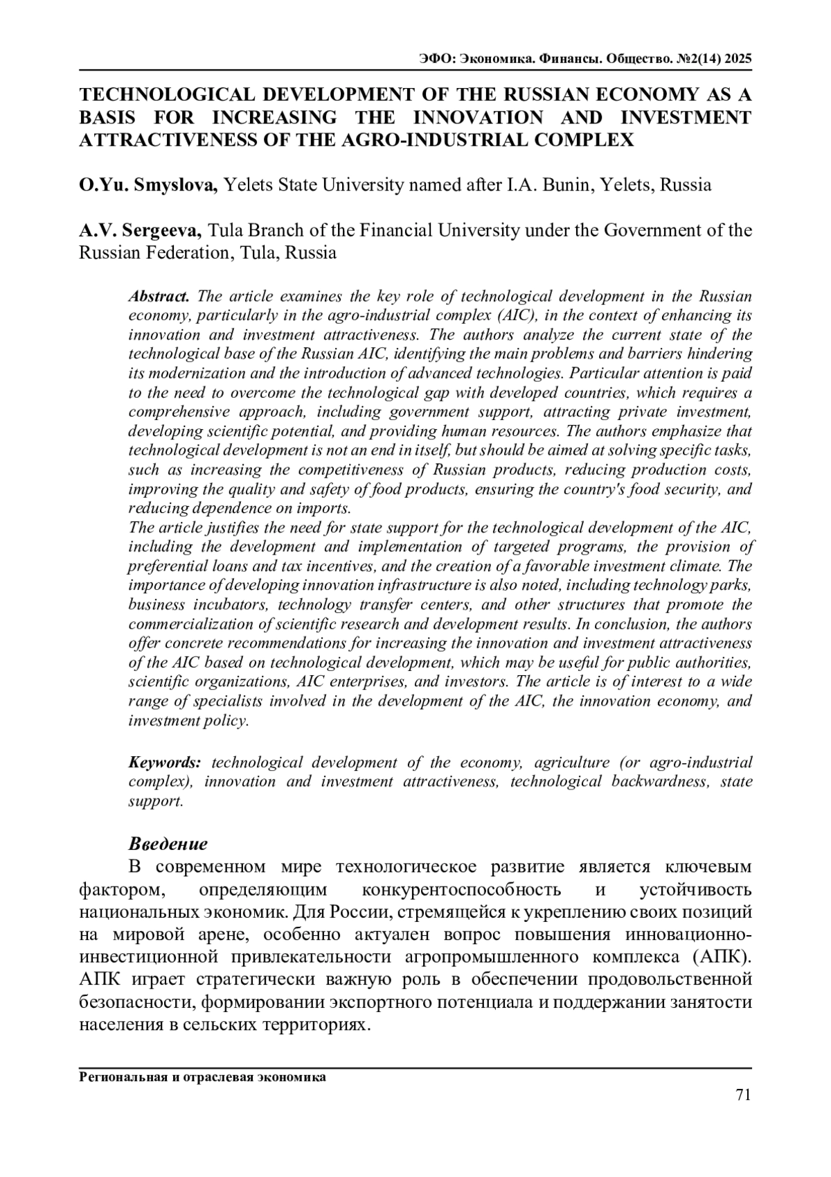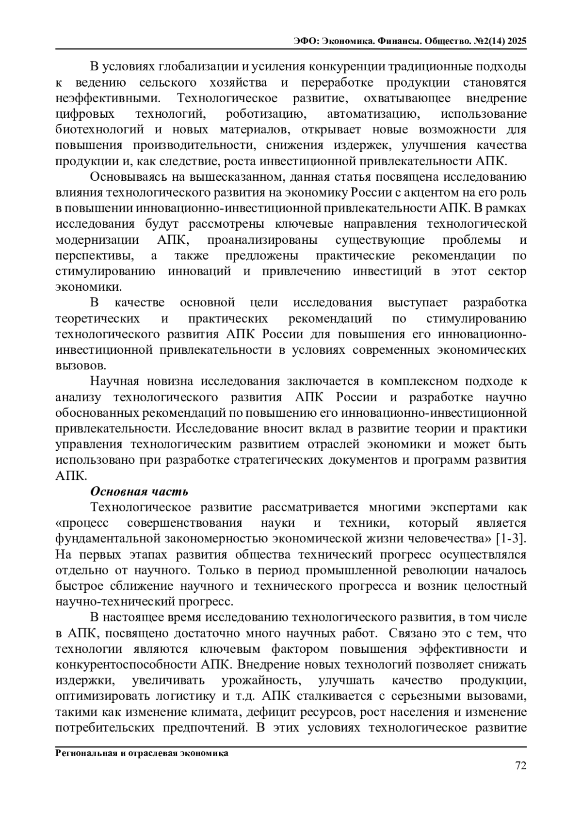 В статье рассматривается ключевая роль технологического развития экономики России, и в частности, агропромышленного комплекса (АПК), в контексте повышения его инновационно-инвестиционной привлекательности. Авторами проводится анализ текущего состояния технологической базы российского АПК, выявляются основные проблемы и барьеры, препятствующие ее модернизации и внедрению передовых технологий. Особое внимание уделяется необходимости преодоления технологического отставания от развитых стран, что требует комплексного подхода, включающего государственную поддержку, привлечение частных инвестиций, развитие научного потенциала и кадрового обеспечения. Авторы подчеркивают, что технологическое развитие не является самоцелью, а должно быть направлено на решение конкретных задач, таких как повышение конкурентоспособности российской продукции, снижение себестоимости, улучшение качества и безопасности продуктов питания, обеспечение продовольственной безопасности страны и снижение зависимости от импорта.