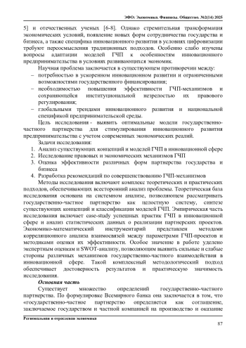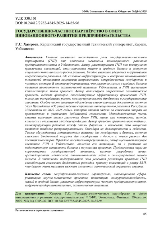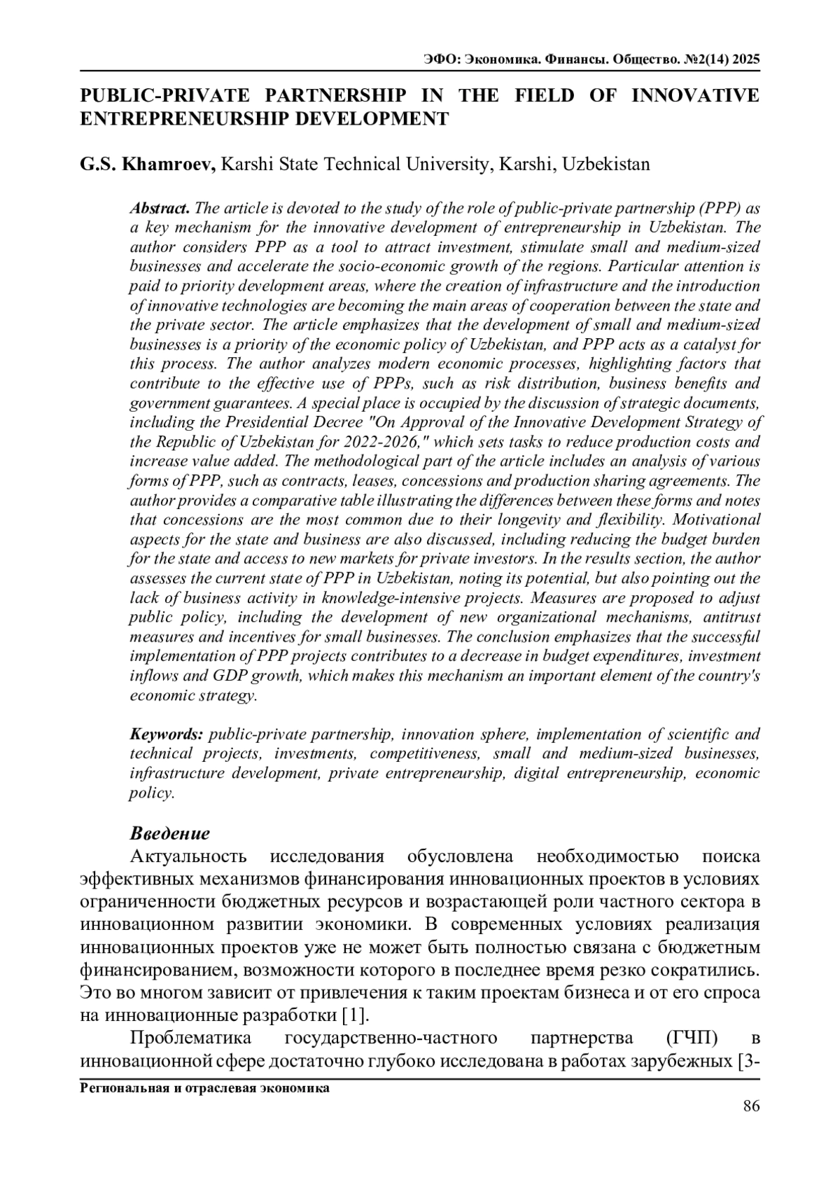 Статья посвящена исследованию роли государственно-частного партнерства (ГЧП) как ключевого механизма инновационного развития предпринимательства в Узбекистане. Автор рассматривает ГЧП как инструмент привлечения инвестиций, стимулирования малого и среднего бизнеса и ускорения социально-экономического роста регионов. Особое внимание уделяется территориям опережающего развития, где создание инфраструктуры и внедрение инновационных технологий становятся основными направлениями сотрудничества государства и частного сектора. В статье подчеркивается, что развитие малого и среднего бизнеса является приоритетом экономической политики Узбекистана, а ГЧП выступает катализатором этого процесса. Автор анализирует современные экономические процессы, выделяя факторы, способствующие эффективному применению ГЧП, такие как распределение рисков, коммерческая выгода для бизнеса и государственные гарантии. Особое место занимает обсуждение стратегических документов, включая Указ Президента «Об утверждении стратегии инновационного развития Республики Узбекистан на 2022–2026 годы», который ставит задачи по снижению затрат на производство и увеличению добавленной стоимости. Методологическая часть статьи включает анализ различных форм ГЧП, таких как контракты, аренда, концессии и соглашения о разделе продукции. Автор приводит сравнительную таблицу, иллюстрирующую различия между этими формами, и отмечает, что концессии являются наиболее распространенными благодаря их долгосрочности и гибкости. Также обсуждаются мотивационные аспекты для государства и бизнеса, включая снижение бюджетной нагрузки для государства и доступ к новым рынкам для частных инвесторов. В разделе, посвященном результатам, автор оценивает текущее состояние ГЧП в Узбекистане, отмечая его потенциал, но и указывая на недостаточную активность бизнеса в наукоемких проектах. Предлагаются меры по корректировке государственной политики, включая разработку новых организационных механизмов, антимонопольные меры и стимулирование малого бизнеса. В заключении подчеркивается, что успешная реализация проектов ГЧП способствует снижению бюджетных расходов, притоку инвестиций и росту ВВП, что делает этот механизм важным элементом экономической стратегии страны.