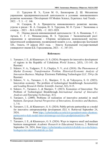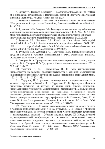 3. 	Sidorov, V. A., Tursunov, I. E., Sharipov, T. S., & Yahyoyeva, S. O. (2023). Innovatsiya iqtisodiyoti: texnologik yutuq muammosi. barqarorlik va yetakchi tadqiqotlar onlayn ilmiy jurnali, 3(2), 8-15.