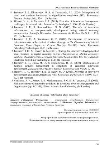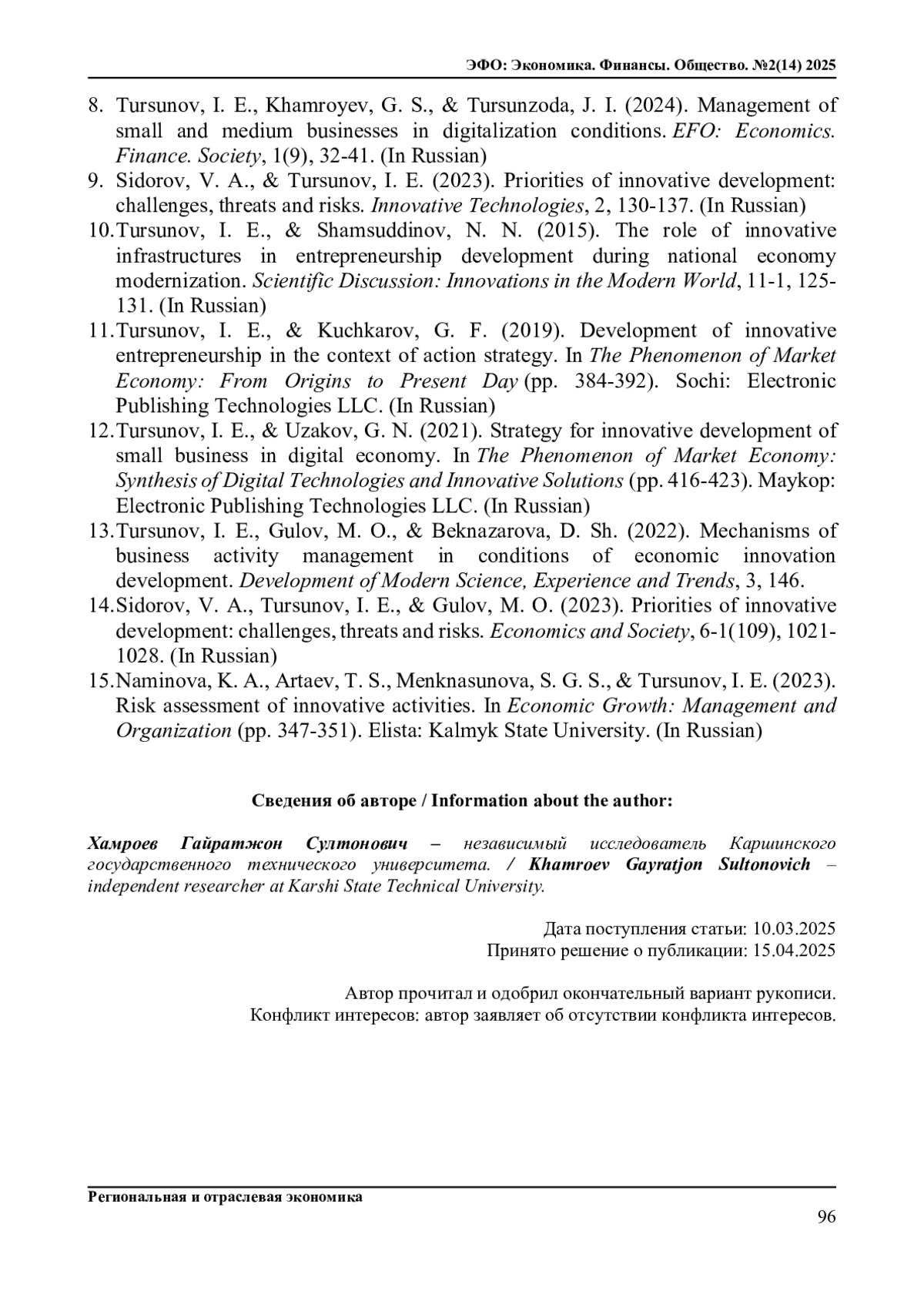 8. 	Турсунов И.Э., Хамроев Г.С., Турсунзода Ж.И. Управление малым и средним бизнесом в условиях цифровизации // ЭФО. Экономика. Финансы. Общество. 2024. №1(9) С.32-41.
