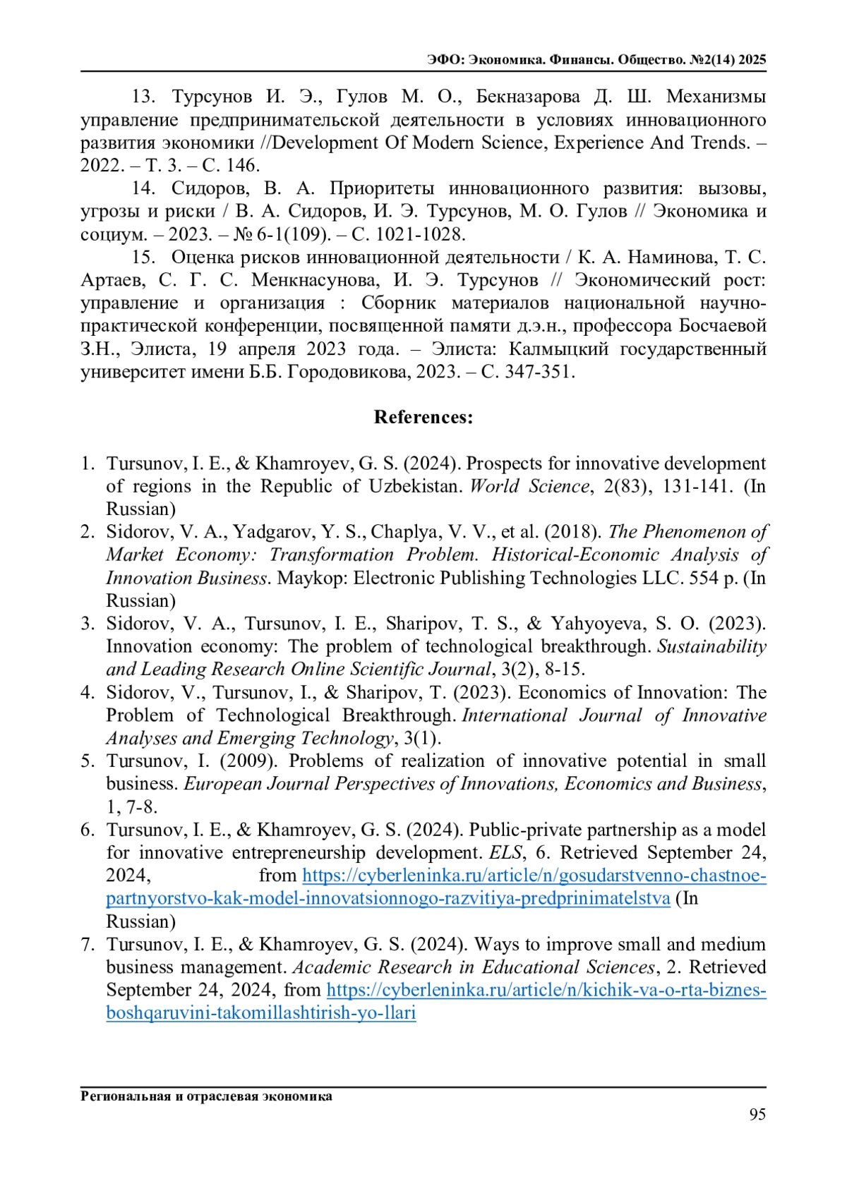 1. 	Турсунов, И. Э. Перспективы инновационного развития регионов Республики Узбекистана / И. Э. Турсунов, Г. С. Хамроев // Мировая наука. - 2024. - № 2(83). - С. 131-141.