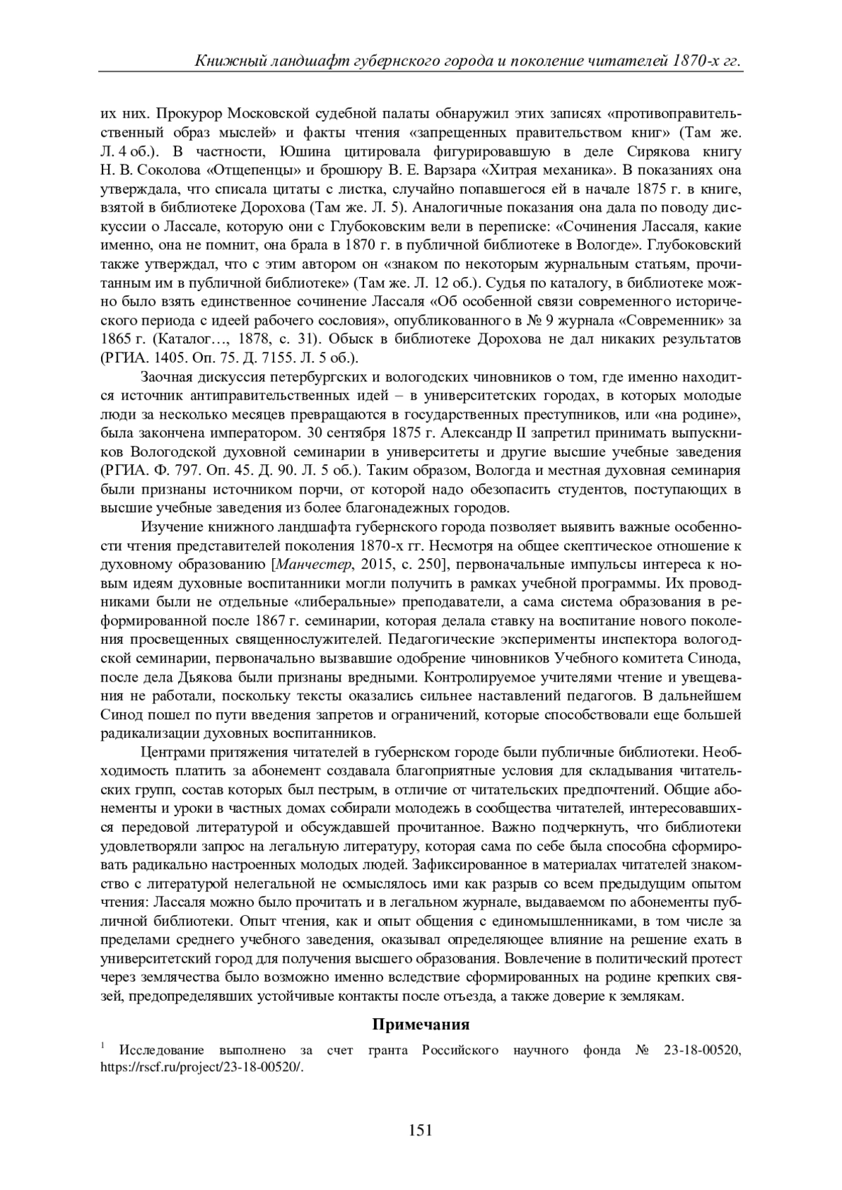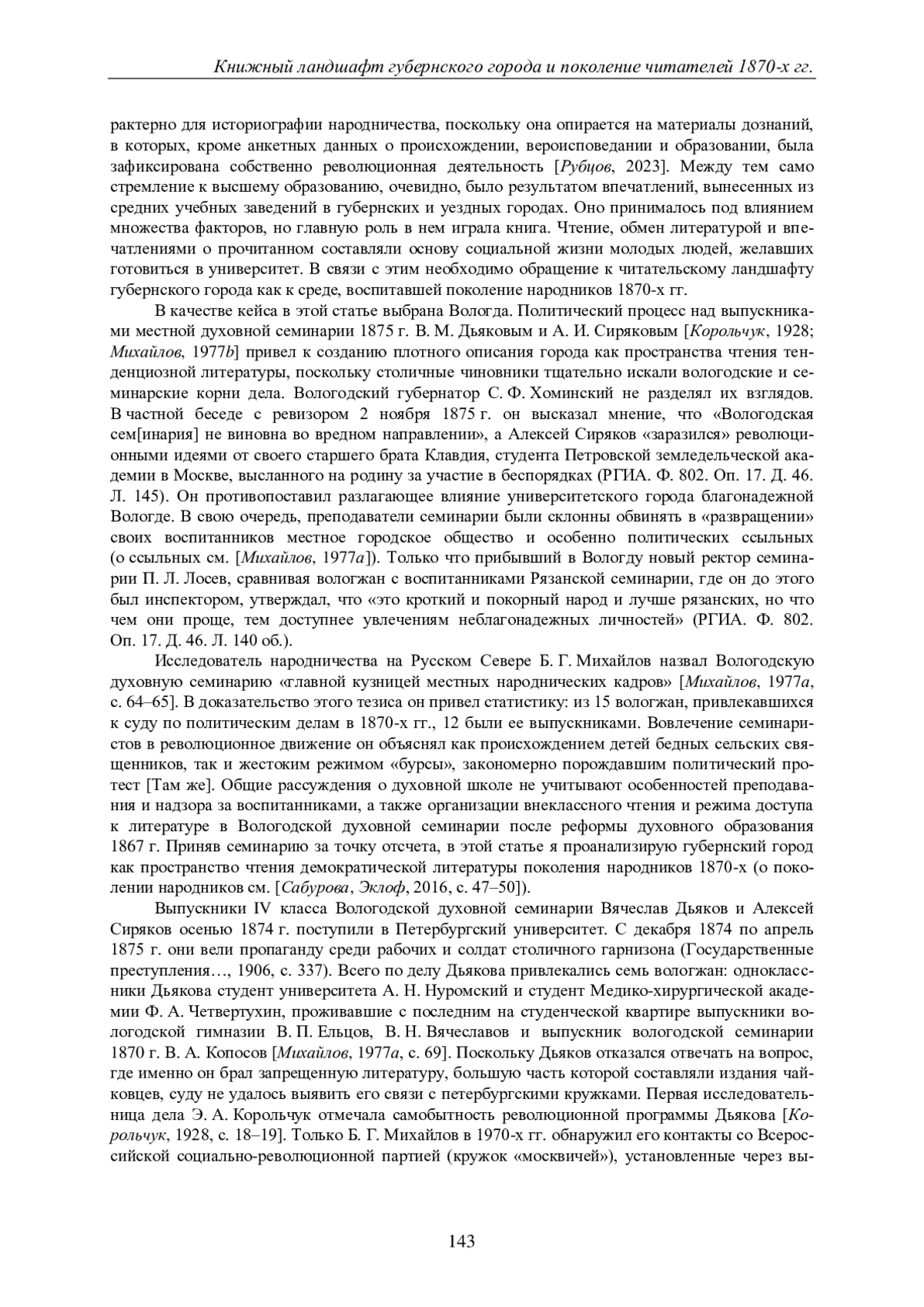 Статья посвящена анализу читательских практик поколения народников 1870-х гг. Смещая фокус внимания с кружков и организаций, сформировавшихся в университетских городах, автор обращается к опыту чтения учеников средних учебных заведений губернского города, определившему их стремление к самообразованию и отъезд из дома. В качестве кейса выбрана Вологда, книжный ландшафт которой подробно описан в материалах экстренной ревизии Вологодской духовной семинарии, проведенной чиновником Учебного комитета Синода осенью 1875 г. в связи с политическим процессом ее выпускников В. М. Дьякова и А. И. Сирякова. В статье анализируются идеи преподавателей семинарии об организации внеклассного чтения и выборе книг, представления о роли педагога в воспитании нового поколения священнослужителей, а также особенности надзора за чтением. Автор показывает, что относительно свободный режим доступа к литературе, первоначально одобряемый чиновниками Синода, был результатом педагогических идей, реализуемых после реформы духовного образования 1867 г. Дело Дьякова поставило под вопрос педагогическую ценность «увещеваний» в постановке внеклассного чтения. Источником литературы для семинаристов служили частные публичные библиотеки. Анализ групповых абонементов семинаристов позволил выявить как основные тенденции чтения учеников разных классов, так и роль библиотеки в формировании групп читателей. Особое внимание уделено книжным связям семинаристов за рамками учебного заведения и духовного сословия, позволяющим говорить об особенностях молодежного чтения в Вологде. Вторым источником формирования светских связей семинаристов были уроки в частных домах. На примере семинариста Матвея Глубоковского и гимназистки Аполлинарии Юшиной показана буквальная локализация читателей в городском пространстве, предопределившая их знакомство, выбор библиотеки и в конце концов арест по одному политическому делу. В заключении делается вывод о влиянии опыта чтения учащихся средних учебных заведений на их дальнейшее вовлечение в политический протест.