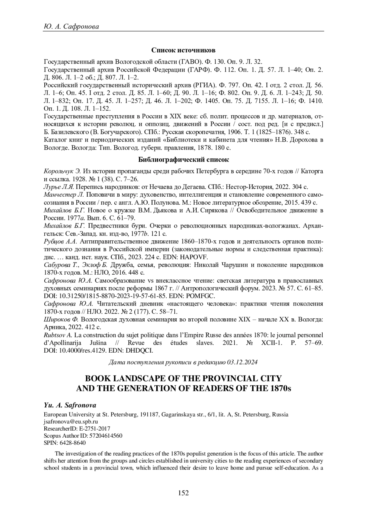 14. Сафронова Ю.А. Читательский дневник “настоящего человека”: практики чтения поколения 1870-х годов // НЛО. 2022. № 2 (177). С. 58-71.