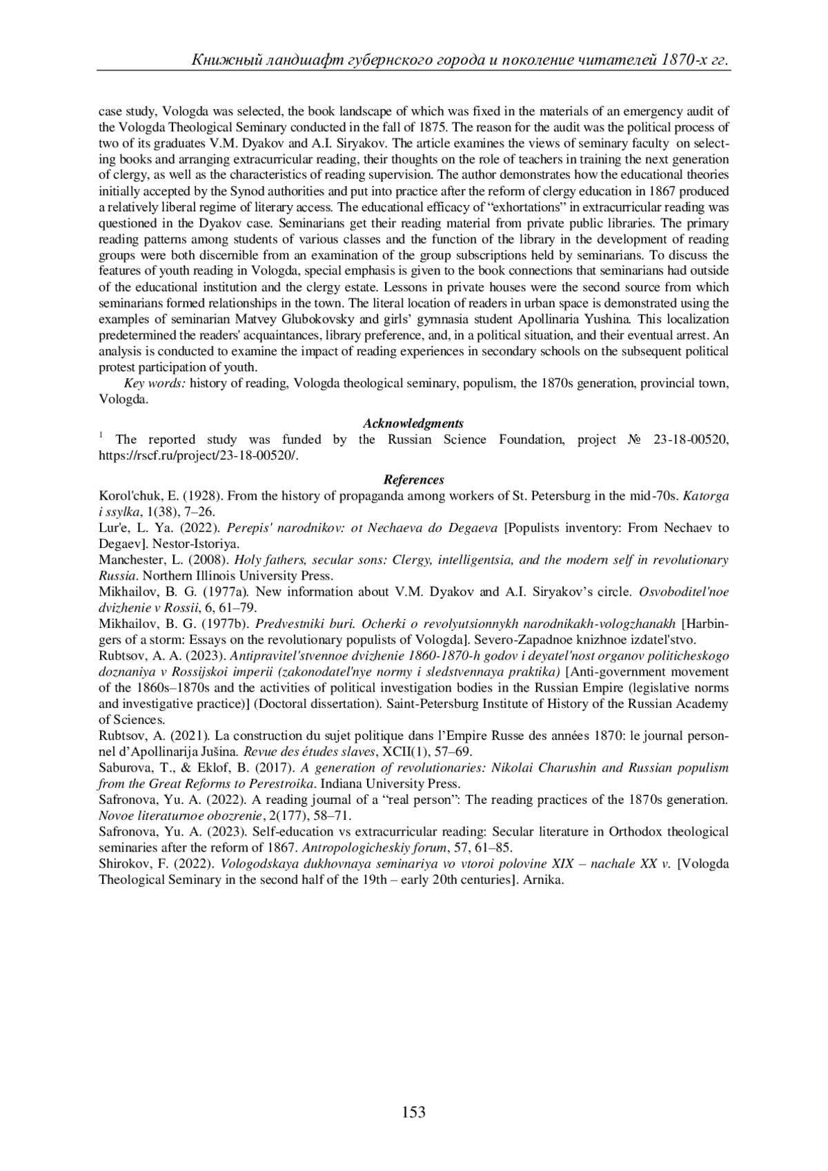 16. Rubtsov A. La construction du sujet politique dans l’Empire Russe des années 1870: le journal personnel d’Apollinarija Jušina // Revue des études slaves. 2021. № XCII-1. P. 57-69. DOI: 10.4000/res.4129 EDN: DHDQCI