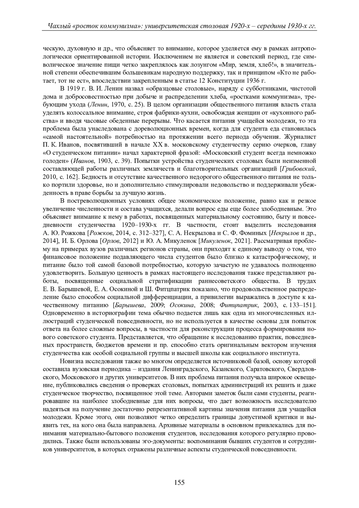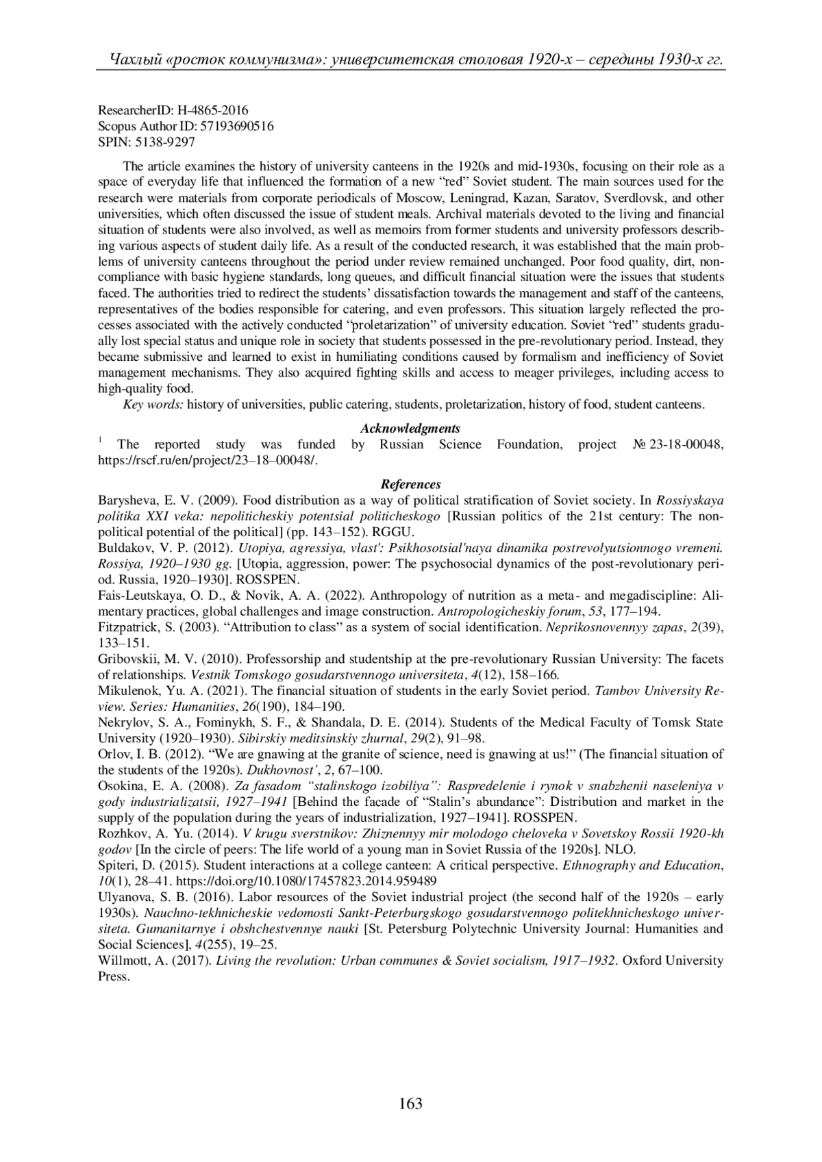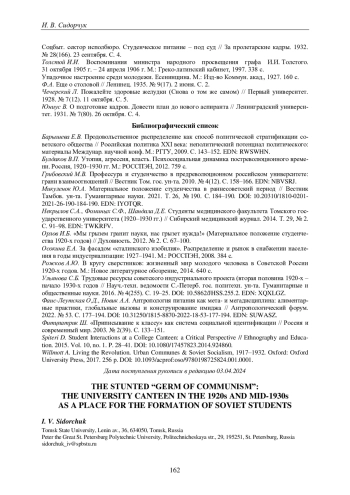 49. 	Микуленок Ю.А. Материальное положение студенчества в раннесоветский период // Вестник Тамбов. ун-та. Гуманитарные науки. 2021. Т. 26, № 190. С. 184-190. DOI: 10.20310/1810-0201-2021-26-190-184-190 EDN: IYOTQR