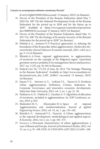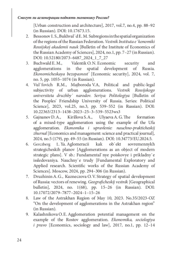 27. 	Suvorova A. Structural characteristics of urban agglomerations: a case of Russia and Europe // Journal of Institutional Studies. 2023. Vol.15. No.4. Pp. 91-108.
