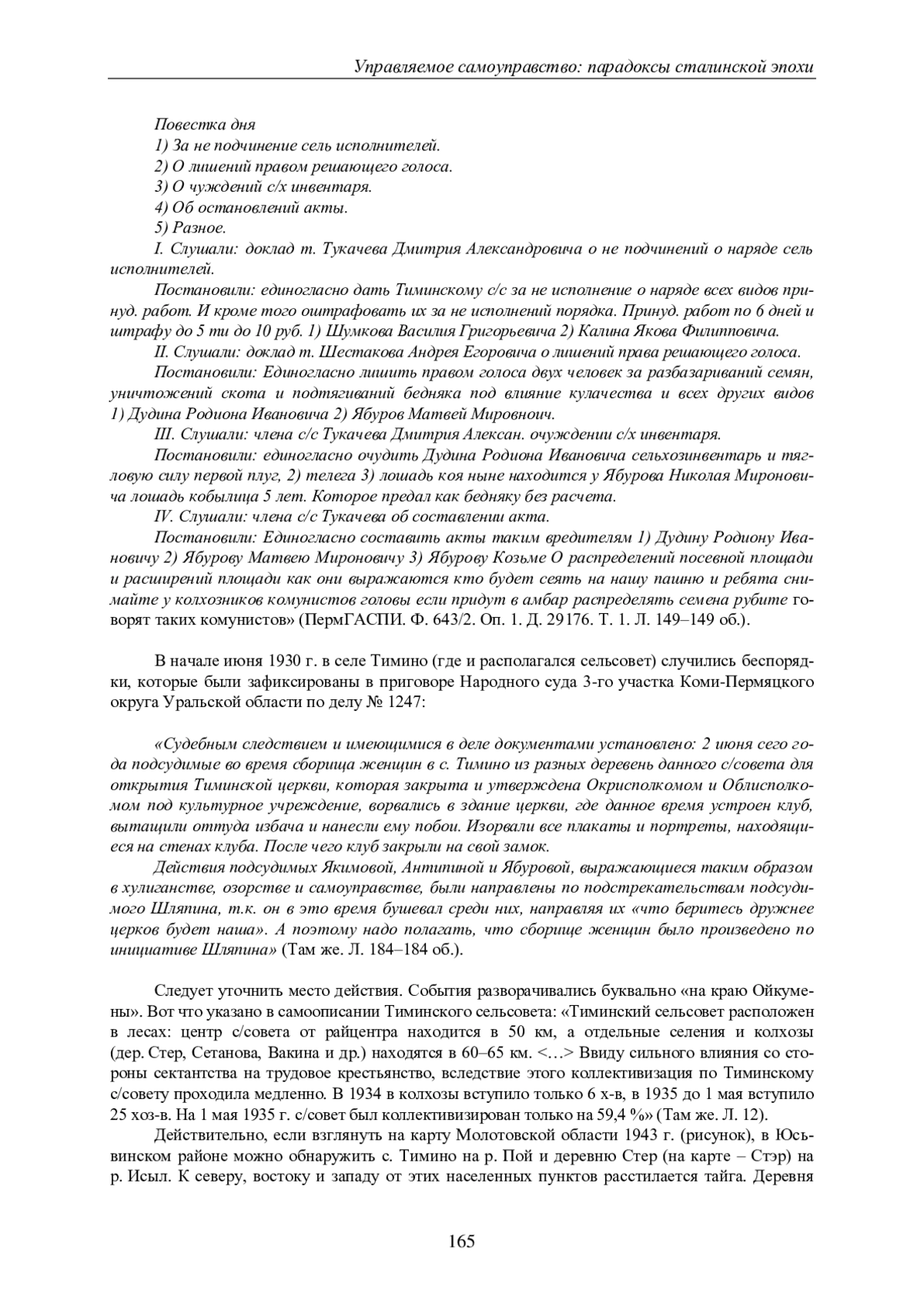 Где-то в конце весны – в начале лета 1930 г. практически синхронно (с интервалом менее чем в месяц) в Тиминском сельсовете Юсьвинского района Коми-Пермяцкого округа Уральской области случилось два вполне заурядных, во многом типичных события. Представим их так, как они были зафиксированы в актах современного им делопроизводства, поскольку язык эпохи всегда доносит трудноулавливаемый иным способом смысл.