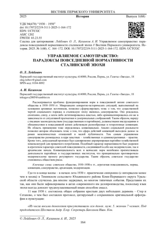 Рассматривается проблема функционирования норм в повседневной жизни советского общества в 1930-1950 гг. Микроанализ конкретно-исторических ситуаций, выполненный на основании архивных источников, позволил сформулировать тезис о том, что существенной чертой социального порядка в сталинскую эпоху являлось самоуправство. Оно рождалось спонтанно, снизу, а затем либо легитимировалось властью, либо криминализировалось ею же в зависимости от ситуативной прагматики и доктринальных соображений. Таким образом, наряду с писаным законодательством (государственным и партийным), должностными инструкциями и обязанностями в повседневной жизни действовали разнообразные и гетерогенные конвенции. Их область применения тоже определялась конвенциально. Анализ социальной реальности позволил авторам обосновать тезис о том, что сфера действий конвенций выходила далеко за рамки межличностных отношений и малой публичности. Тем самым управляемое самоуправство размещалось в ядре властных - хозяйственных и административных - практик. Кроме того, допускаемый произвол был одновременно апроприирован партийно-хозяйственной номенклатурой для приватного потребления. Подобный характер нормативности был укоренен в агрегатном характере советской повседневности, соединявшей в себе как модернистские, так и архаические начала. Конвенциальность всех и всяческих норм неизбежно препятствовала деятельности партийных и государственных институтов, что принципиально противоречило модернистскому проекту регулярного государства. Таким образом, советское государство становилось обществом риска.