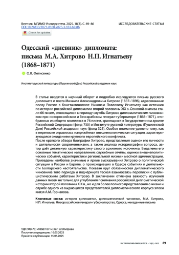 В статье вводятся в научный оборот и подробно исследуются письма русского дипломата и поэта Михаила Александровича Хитрово (1837–1896), адресованные послу России в Константинополе Николаю Павловичу Игнатьеву, как источник по истории российской дипломатии второй половины XIX века. Основой анализа стали 66 писем, относящихся к периоду службы Хитрово дипломатическим чиновником при новороссийском и бессарабском генерал-губернаторе (1868–1871), отобранных из общего комплекса в 76 писем, хранящихся в Государственном архиве Российской Федерации (фонд 730) и Институте русской литературы (Пушкинский Дом) Российской академии наук (фонд 325). Особое внимание уделено тому, как в переписке отразилась напряжённая внешнеполитическая ситуация, характеризующаяся ожиданием крупного европейского конфликта. После краткого обзора биографии Хитрово, представления оценок его личности и деятельности современниками, а также анализа историографии вопроса, автор даёт детальную характеристику самого архивного источника. Выделены его основные тематические направления: служебные отчёты, оценки внешнеполитических событий, характеристики региональной жизни и местной администрации. Приведены наиболее значимые и яркие высказывания Хитрово о политической ситуации в России и Европе, о происходивших в Одессе событиях и деятельности Болгарского настоятельства. Показан круг обязанностей дипломатического чиновника того периода и подчёркнута тесная взаимосвязь переписки с публицистическими работами Хитрово. В заключении отмечена важность изучения данных писем не только для углубления понимания российской дипломатической истории второй половины XIX века, но и для более полного представления о жизни и службе одного из выдающихся представителей дипломатического корпуса эпохи князя А. М. Горчакова.