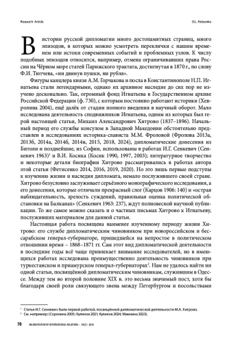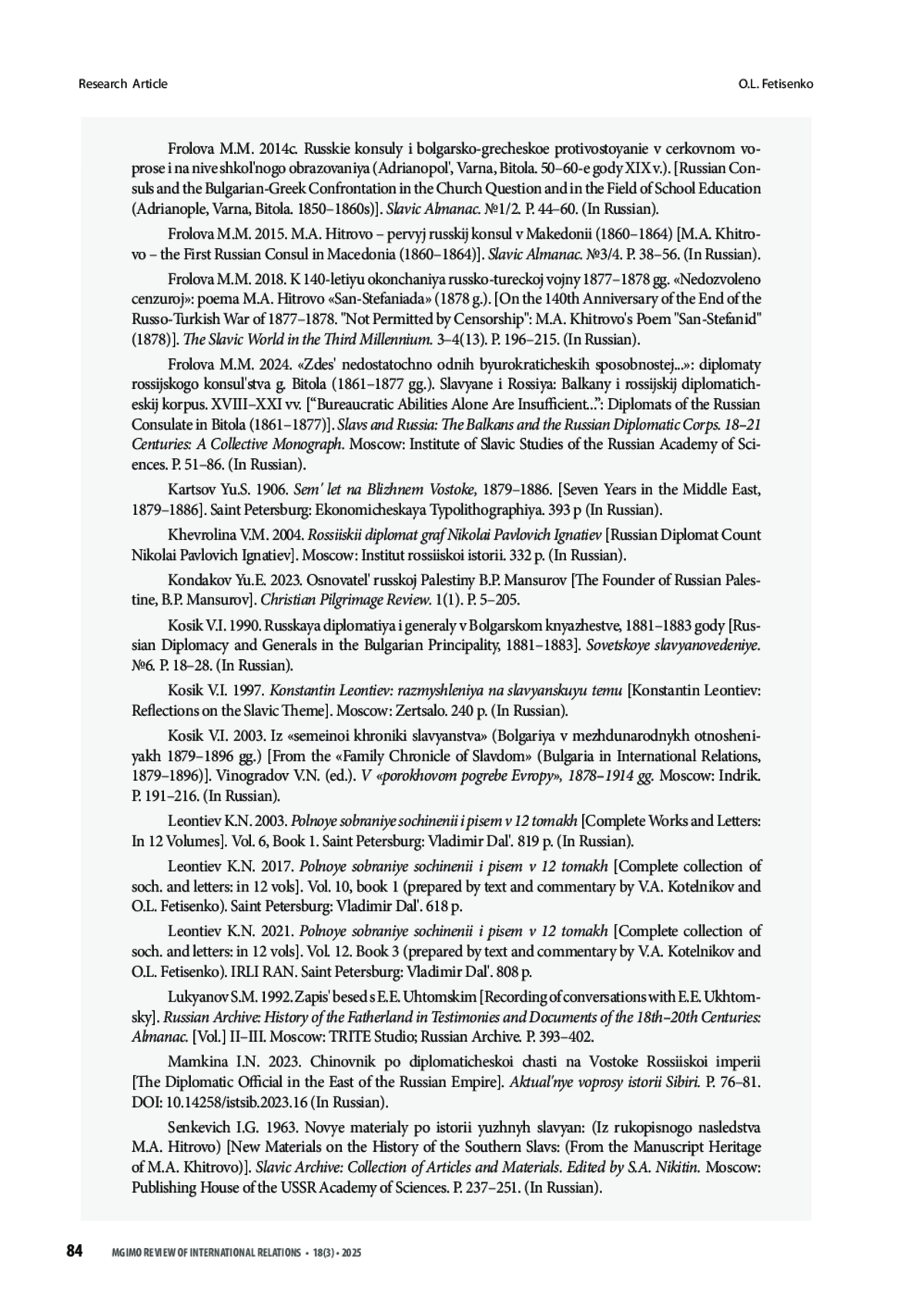 27. Фролова М.М. 2024. «Здесь недостаточно одних бюрократических способностей...»: дипломаты российского консульства г. Битола (1861-1877 гг.). Славяне и Россия: Балканы и российский дипломатический корпус. XVIII-XXI вв.: Колл. монография. М.: Институт славяноведения РАН. С. 51-86.