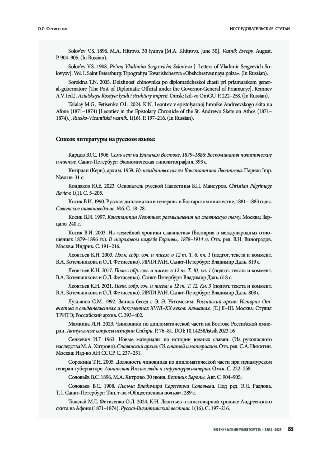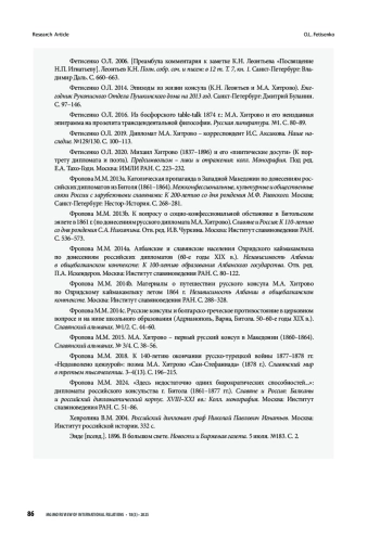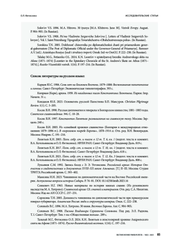 16. Фетисенко О.Л. 2014. Эпизоды из жизни консула (К. Н. Леонтьев и М. А. Хитрово). Ежегодник Рукописного Отдела Пушкинского дома на 2013 год. СПб.: Дмитрий Буланин, С. 97-146.