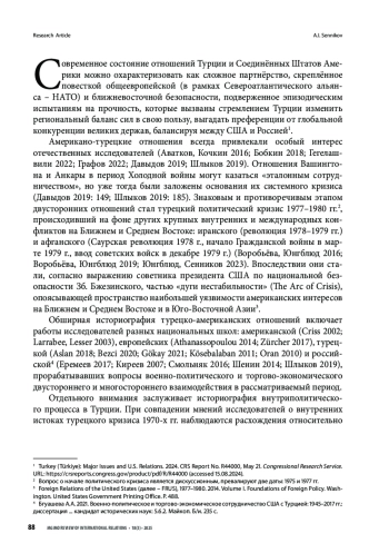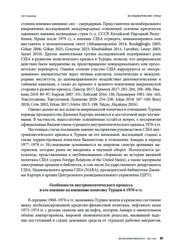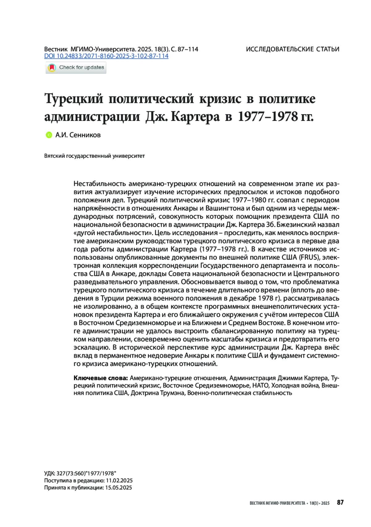 Нестабильность американо-турецких отношений на современном этапе их развития актуализирует изучение исторических предпосылок и истоков подобного положения дел. Турецкий политический кризис 1977–1980 гг. совпал с периодом напряжённости в отношениях Анкары и Вашингтона и был одним из череды международных потрясений, совокупность которых помощник президента США по национальной безопасности в администрации Дж. Картера Зб. Бжезинский назвал «дугой нестабильности». Цель исследования – проследить, как менялось восприятие американским руководством турецкого политического кризиса в первые два года работы администрации Картера (1977–1978 гг.). В качестве источников использованы опубликованные документы по внешней политике США (FRUS), электронная коллекция корреспонденции Государственного департамента и посольства США в Анкаре, доклады Совета национальной безопасности и Центрального разведывательного управления. Обосновывается вывод о том, что проблематика турецкого политического кризиса в течение длительного времени (вплоть до введения в Турции режима военного положения в декабре 1978 г). рассматривалась не изолированно, а в общем контексте программных внешнеполитических установок президента Картера и его ближайшего окружения с учётом интересов США в Восточном Средиземноморье и на Ближнем и Среднем Востоке. В конечном итоге администрации не удалось выстроить сбалансированную политику на турецком направлении, своевременно оценить масштабы кризиса и предотвратить его эскалацию. В исторической перспективе курс администрации Дж. Картера внёс вклад в перманентное недоверие Анкары к политике США и фундамент системного кризиса американо-турецких отношений.