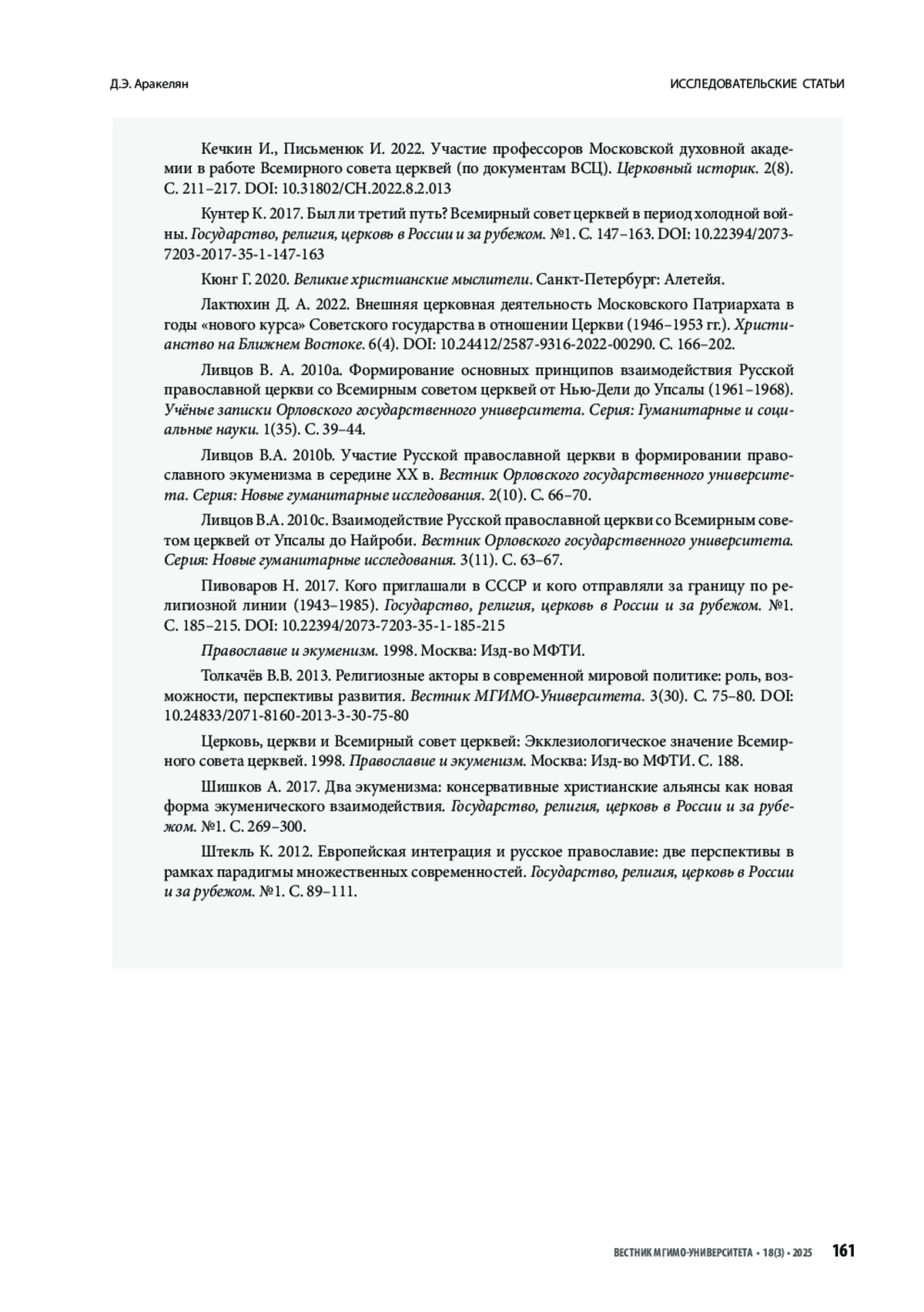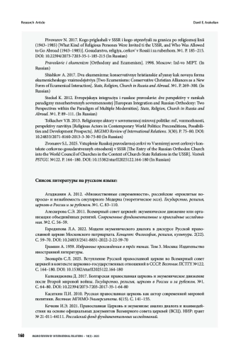28. Пивоваров Н. 2017. Кого приглашали в СССР и кого отправляли за границу по религиозной линии (1943-1985). Государство, религия, церковь в России и за рубежом. №1. С. 185-215. https://doi.org/10.22394/2073-7203-35-1-185-215 Православие и экуменизм. 1998. Москва: Изд-во МФТИ.