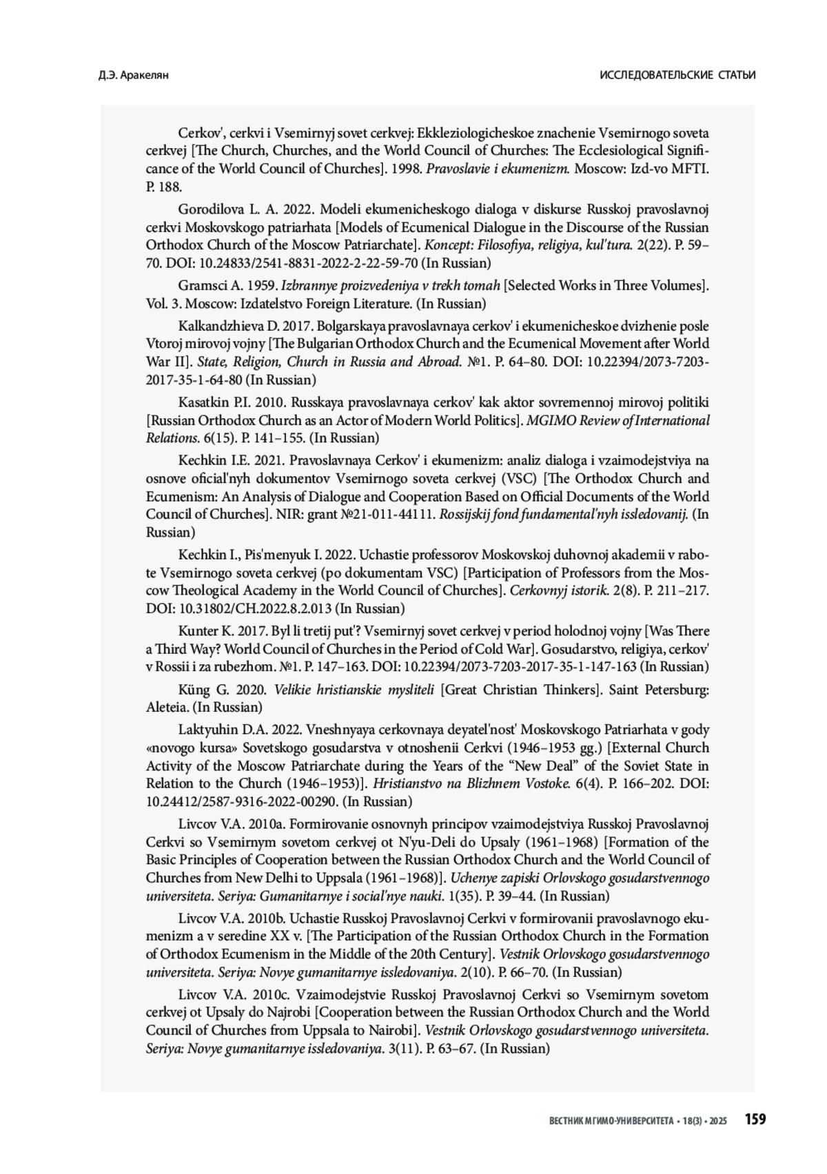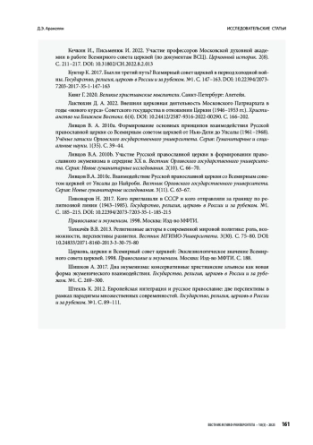 25. Ливцов В. А. 2010a. Формирование основных принципов взаимодействия Русской православной церкви со Всемирным советом церквей от Нью-Дели до Упсалы (1961-1968). Учёные записки Орловского государственного университета. Серия: Гуманитарные и социальные науки. 1(35). С. 39-44.