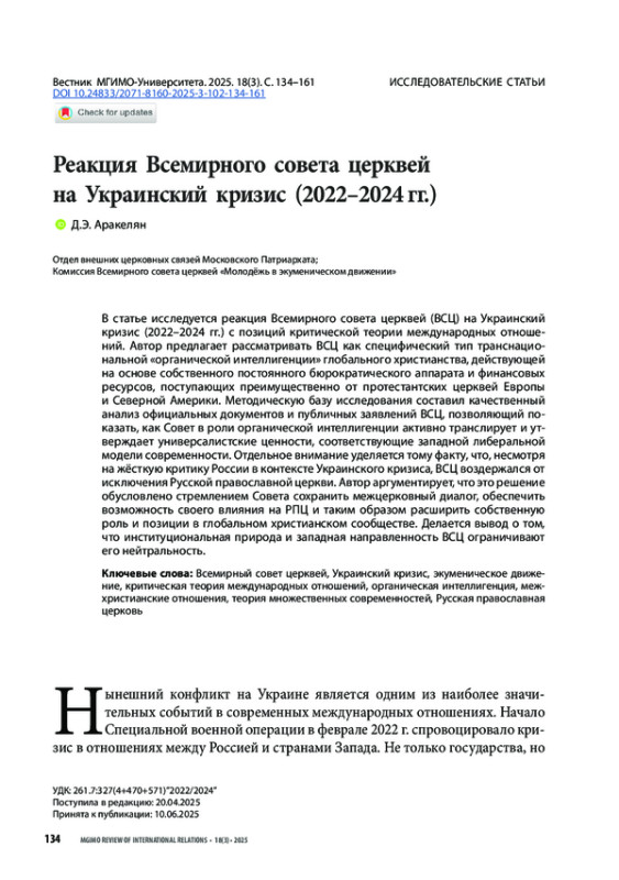 В статье исследуется реакция Всемирного совета церквей (ВСЦ) на Украинский кризис (2022–2024 гг.) с позиций критической теории международных отношений. Автор предлагает рассматривать ВСЦ как специфический тип транснациональной «органической интеллигенции» глобального христианства, действующей на основе собственного постоянного бюрократического аппарата и финансовых ресурсов, поступающих преимущественно от протестантских церквей Европы и Северной Америки. Методическую базу исследования составил качественный анализ официальных документов и публичных заявлений ВСЦ, позволяющий показать, как Совет в роли органической интеллигенции активно транслирует и утверждает универсалистские ценности, соответствующие западной либеральной модели современности. Отдельное внимание уделяется тому факту, что, несмотря на жёсткую критику России в контексте Украинского кризиса, ВСЦ воздержался от исключения Русской православной церкви. Автор аргументирует, что это решение обусловлено стремлением Совета сохранить межцерковный диалог, обеспечить возможность своего влияния на РПЦ и таким образом расширить собственную роль и позиции в глобальном христианском сообществе. Делается вывод о том, что институциональная природа и западная направленность ВСЦ ограничивают его нейтральность.