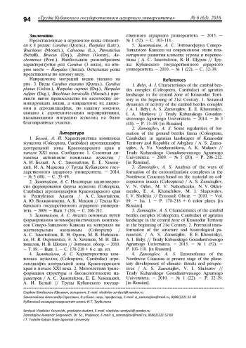 Приводятся данные по видовому составу жужелиц агроценозов ФГБНУ ВНИИБЗР в черте г. Краснодара. Исследовано 9 опытных участков, выявлено 12 преобладающих видов из 8 родов жужелиц. Основными критериями выбора агроценозов являлась пространственная близость участков, позволяющая проследить миграции жужелиц, разнообразие сельскохозяйственных культур и внесение в почву различных препаратов как химического, так и биологического происхождения. Описывается сезонная динамика активности карабидокомплекса. Проанализирован материал, собранный почвенными ловушками Барбера в 2016 году. Определено, что наибольшее видовое разнообразие отмечается в летний период. Преобладающими видами в весенний период являются Carabus exaratus, Carabus planus, Harpalus rufipes, Harpalus cupreus и Brachinus brevicollis, в летний период - Carabus planus, Carabus exaratus, Harpalus cupreus, Harpalus rufipes, Anchomenus dorsalis и Brachinus brevicollis, а в осенний период - Carabus planus, Carabus exaratus, Harpalus cupreus, Harpalus rufipes и Brachinus brevicollis. Для установления основного вектора перемещения жужелиц в агроландшафтах проведена обработка данных по динамике численности и обилию видов жужелиц. Установлены направления миграций массовых видов. Полученные данные имеют определенное значение для конкретизации представлений о фауне жужелиц агроценозов города Краснодара и могут быть использованы при составлении кадастров животного мира этого муниципального образования.