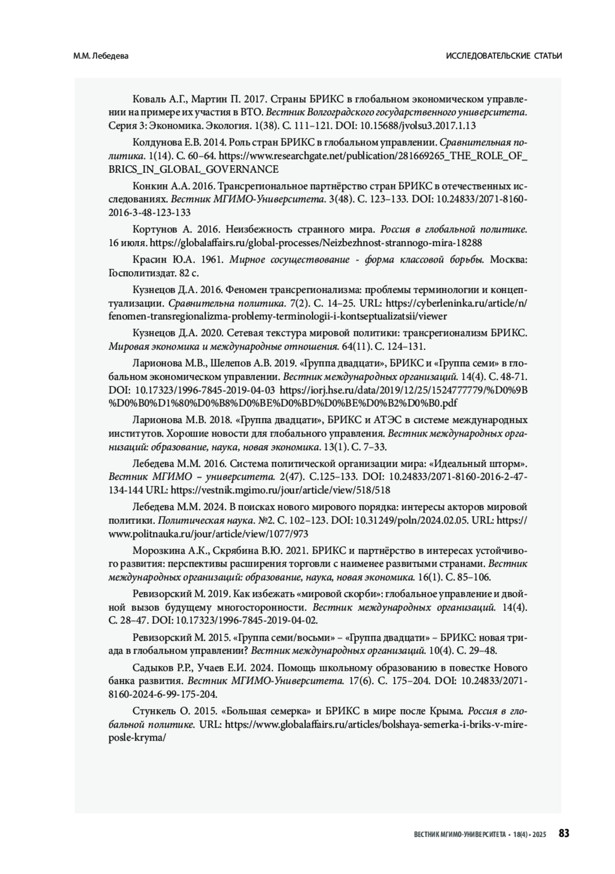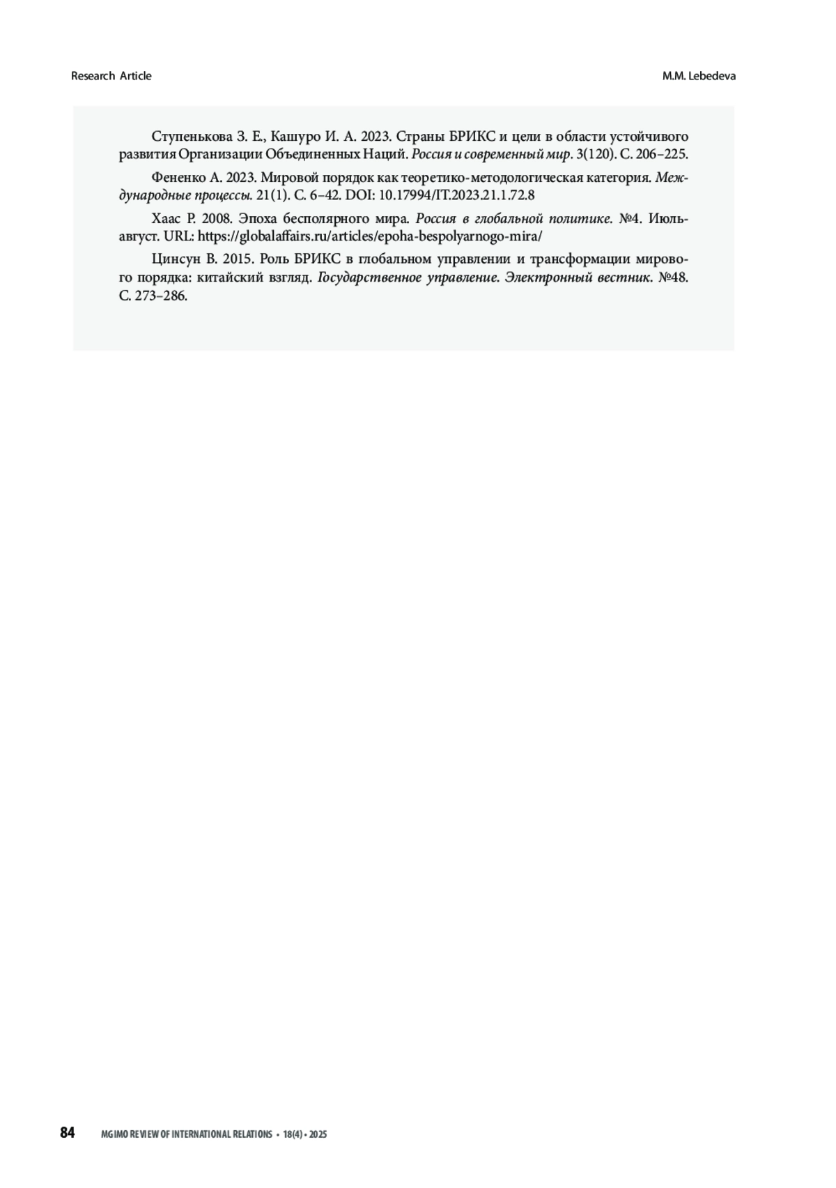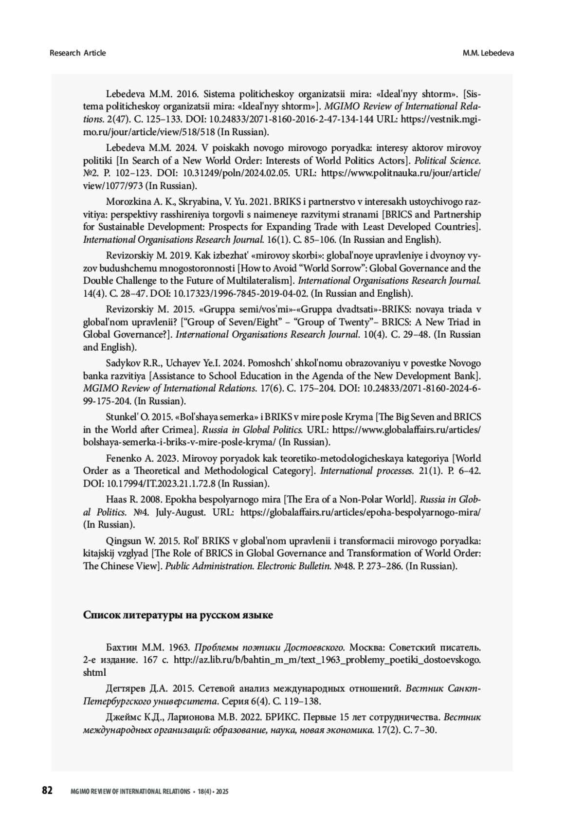 17. Yanano Mangani D. 2024. BRICS as a Catalyst for Global Governance Transformation: Beyond Western Perceptions. MGIMO Review of International Relations. 17(1). P. 46-64. https://doi.org/10.24833/2071-8160-2024-1-94-46-64