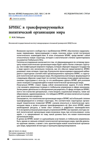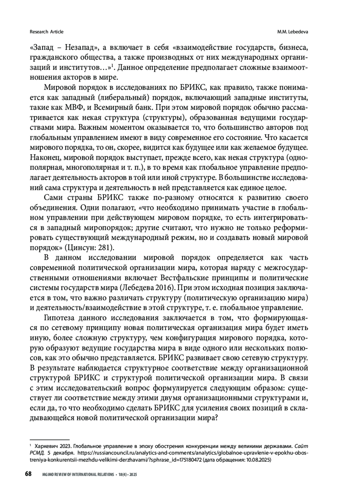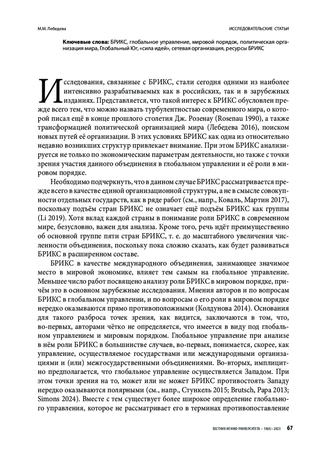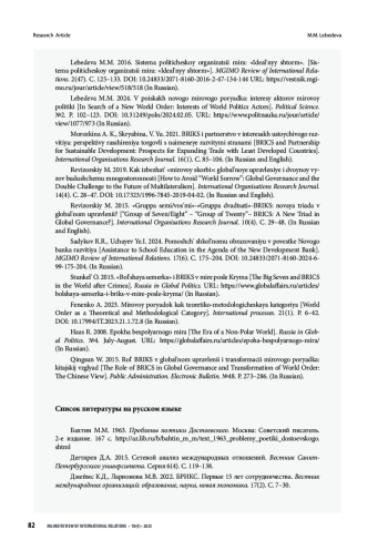 17. Yanano Mangani D. 2024. BRICS as a Catalyst for Global Governance Transformation: Beyond Western Perceptions. MGIMO Review of International Relations. 17(1). P. 46-64. https://doi.org/10.24833/2071-8160-2024-1-94-46-64