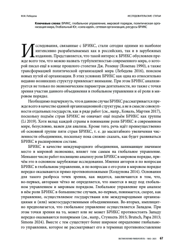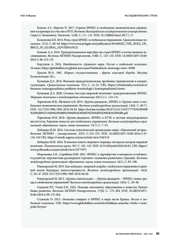 35. Ревизорский М. 2015. «Группа семи/восьми» - «Группа двадцати» - БРИКС: новая триада в глобальном управлении? Вестник международных организаций. 10(4). С. 29-48.