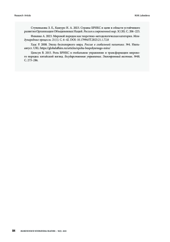 32. Лебедева М.М. 2024. В поисках нового мирового порядка: интересы акторов мировой политики. Политическая наука. №2. С. 102-123. https://doi.org/10.31249/poln/2024.02.05. URL: https://doiw.politnauka.ru/jour/article/view/1077/973