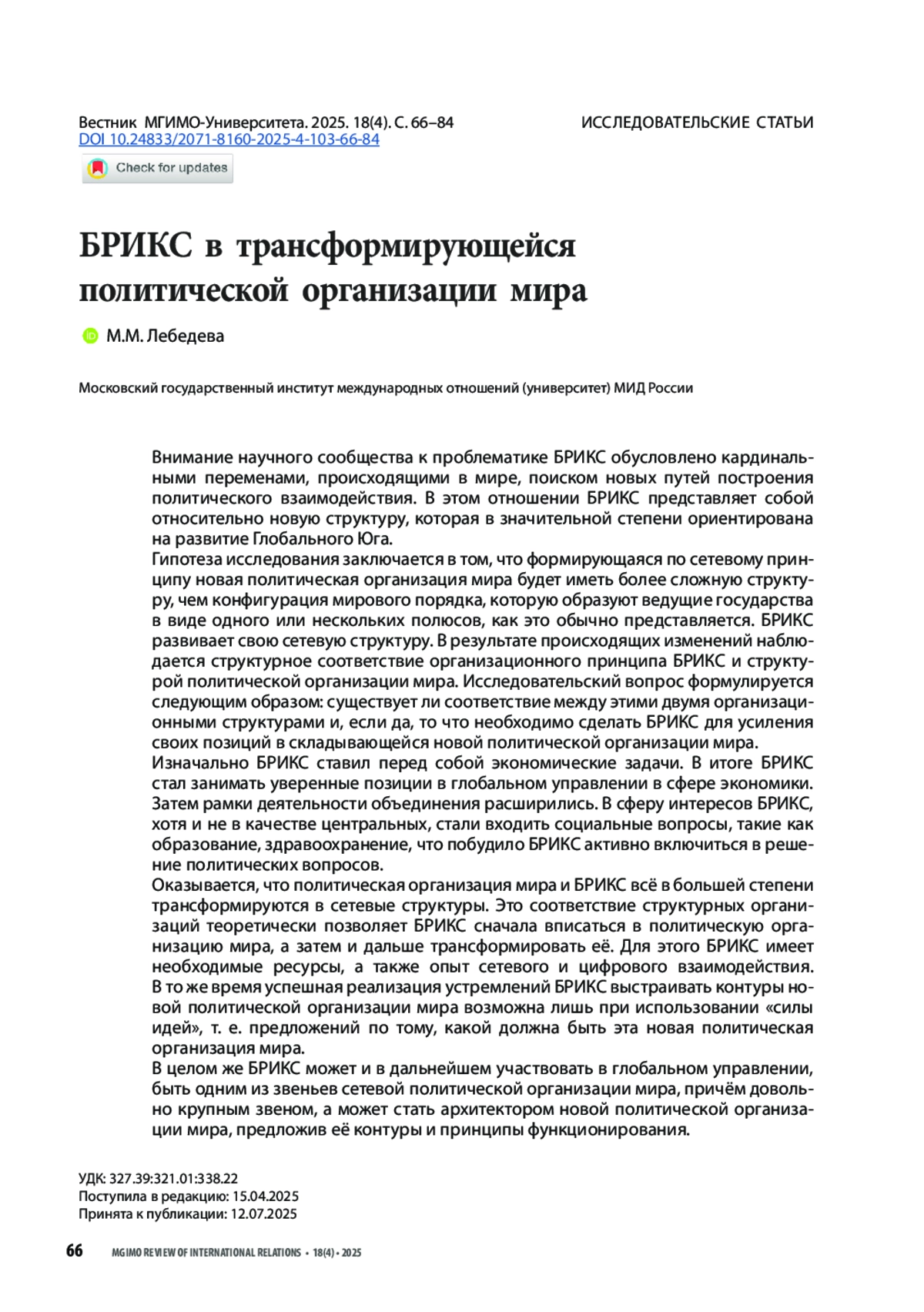 4. Kharitonova O., Arkhangelskaya U. 2025. UN General Assembly Voting as the Indicator of BRICS Consolidation. Social Science Research Network (SSRN) URL: https://ssrn.com/abstract= https://papers.ssrn.com/sol3/papers.cfm?abstract_id=5134460