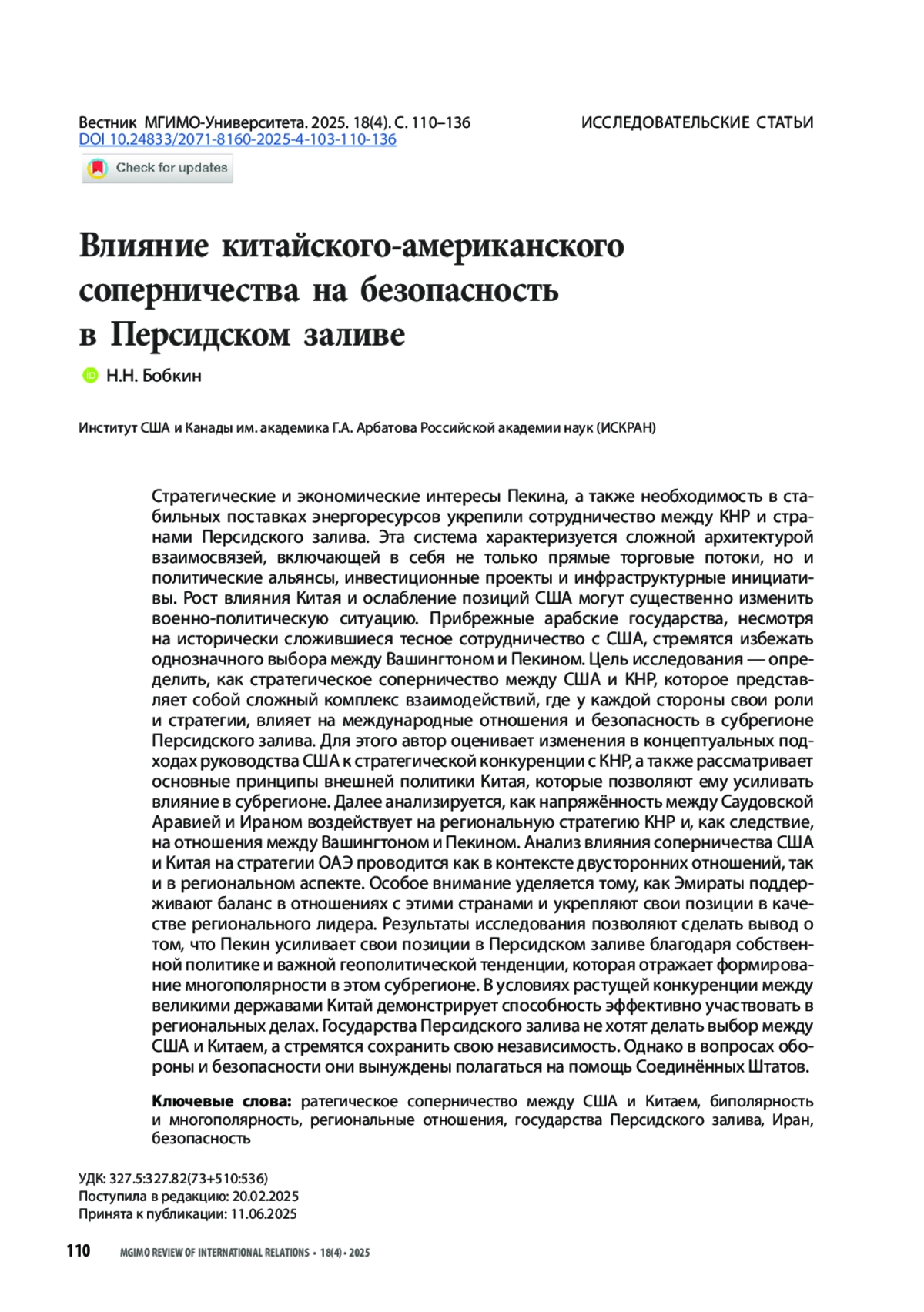 19. Бобкин Н.Н. 2024. Соперничество между США и Китаем на Ближнем Востоке: последствия для региональной и глобальной политики. США и Канада: экономика, политика, культура. 1(649). С. 18-34. https://doi.org/10.31857/S2686673024010021.