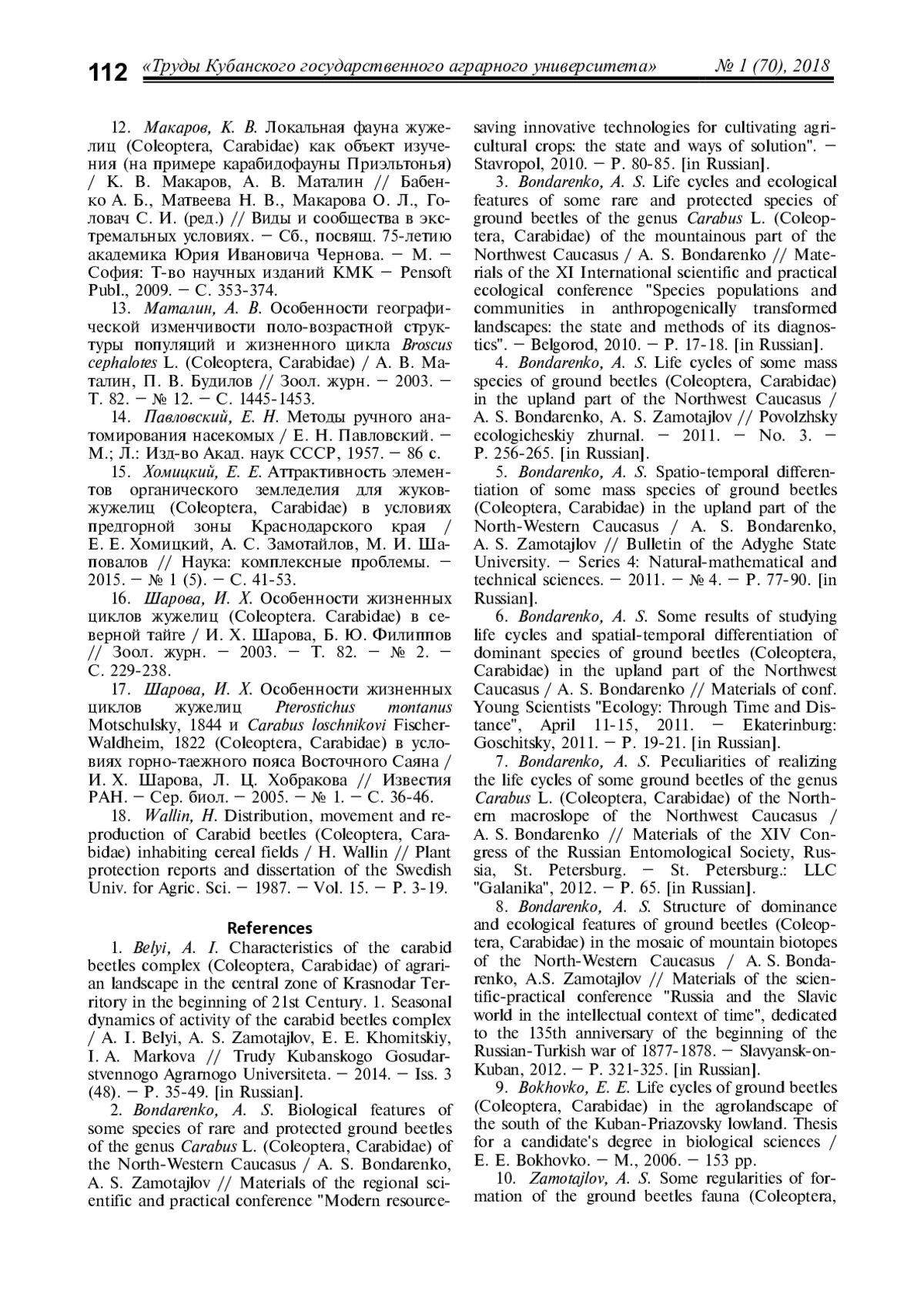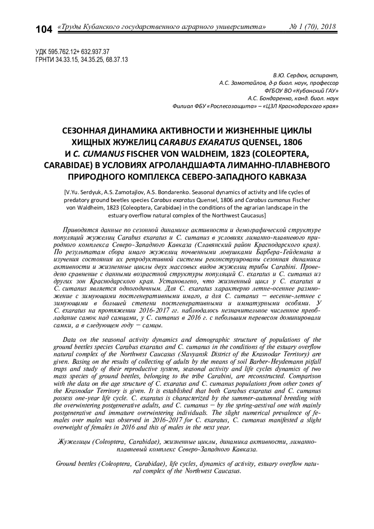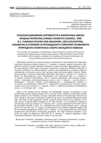 Приводятся данные по сезонной динамике активности и демографической структуре популяций жужелиц Carabus exaratus и C. cumanus в условиях лиманно-плавневого природного комплекса Северо-Западного Кавказа (Славянский район Краснодарского края). По результатам сбора имаго жужелиц почвенными ловушками Барбера-Гейдемана и изучения состояния их репродуктивной системы реконструированы сезонная динамика активности и жизненные циклы двух массовых видов жужелиц трибы Carabini. Проведено сравнение с данными возрастной структуры популяций C. exaratus и C. cumanus из других зон Краснодарского края. Установлено, что жизненный цикл у С. exaratus и C. cumanus является одногодичным. Для C. exaratus характерно летне-осеннее размножение с зимующими постгенеративными имаго, а для C. сumanus - весенне-летнее с зимующими в большей степени постгенеративными и имматурными особями. У C. exaratus на протяжении 2016-2017 гг. наблюдалось незначительное численное преобладание самок над самцами, у C. cumanus в 2016 г. с небольшим перевесом доминировали самки, а в следующем году - самцы.