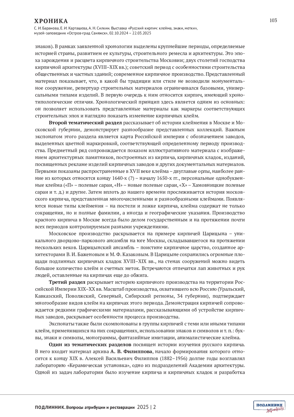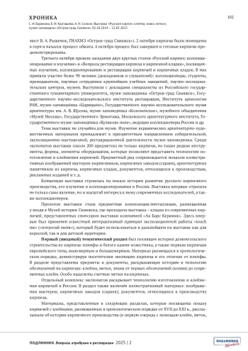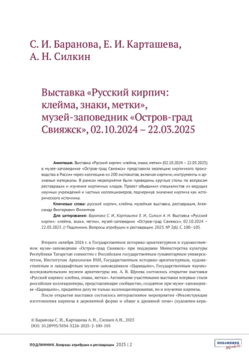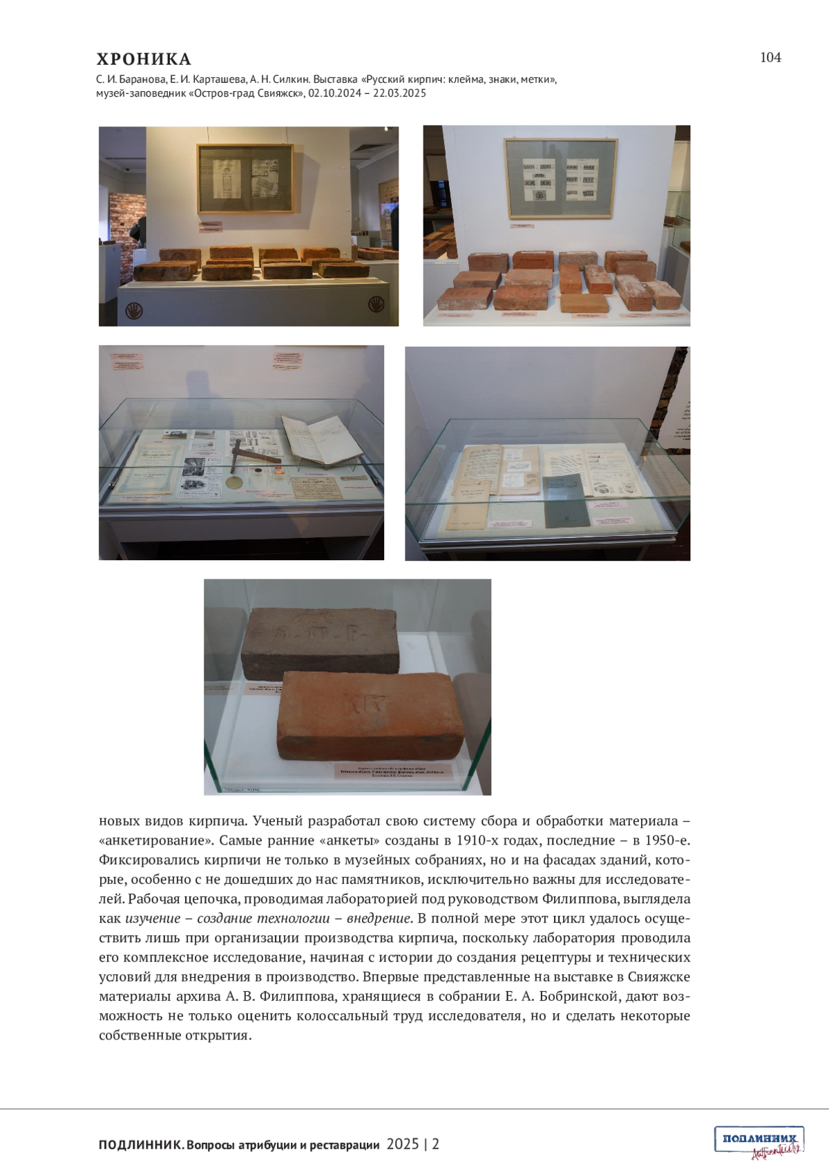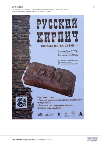 Выставка «Русский кирпич: клейма, знаки, метки» (02.10.2024 – 22.03.2025) в музее-заповеднике «Остров-град Свияжск» представила эволюцию кирпичного производства в России через коллекцию из 200 экспонатов, включая кирпичи, инструменты и архивные материалы. В рамках мероприятия были проведены круглые столы по вопросам реставрации и изучения кирпичных кладок. Проект объединил специалистов из ведущих научных учреждений и частных коллекционеров, подчеркнув значение кирпича как исторического источника.