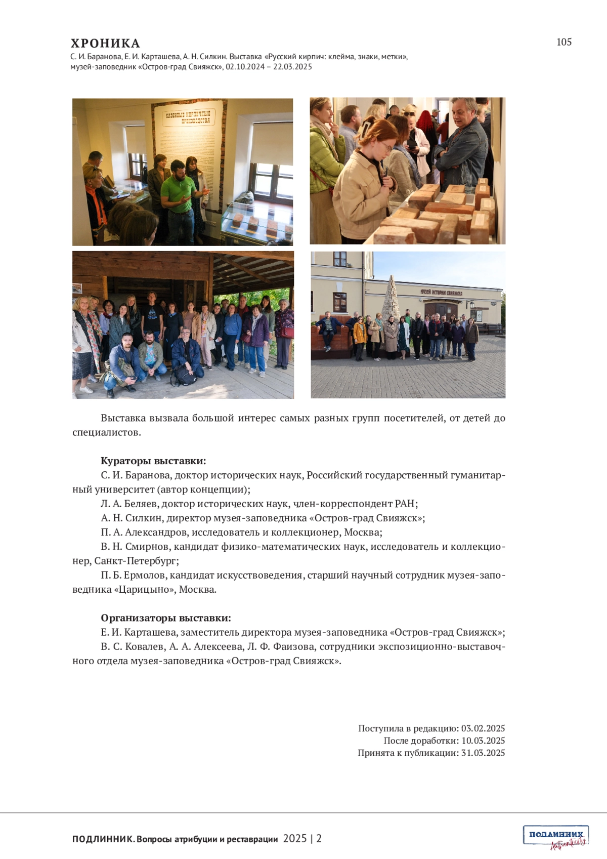 Второго октября 2024 г. в Государственном историко-архитектурном и художественном музее-заповеднике «Остров-град Свияжск» при поддержке Министерства культуры Республики Татарстан совместно с Российским государственным гуманитарным университетом, Институтом Археологии РАН, Государственным историко-архитектурным, художественным и ландшафтным музеем-заповедником «Царицыно», Государственным научноисследовательским музеем архитектуры им. А. В. Щусева состоялось открытие выставки «Русский кирпич: клейма, знаки, метки». Активными участниками выставки впервые стали российские коллекционеры, представляющие сообщество, созданное при музее-заповеднике «Царицыно», преданное делу не только коллекционирования, но и изучения кирпича.