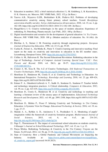 19. Henriksen D., Creely E., Henderson M. et al. Creativity and technology in teaching and learning: a literature review of the uneasy space of implementation // Educational Technology Research and Development. 2021. Vol. 69. Pp. 2091-2108. https://doi.org/10.1007/s11423-020-09912-z.