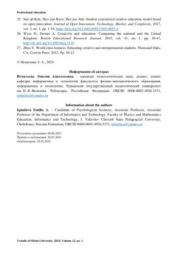 5. Игнатьева Э. А. Потенциал внесения креативных технологий в работу со школьниками // Формирование мышления в процессе обучения естественнонаучным, технологическим иматематическим дисциплинам: материалы Всероссийской научно-практической конференции / отв. редактор А. П. Усольцев. Екатеринбург, 2023. С. 31-34.