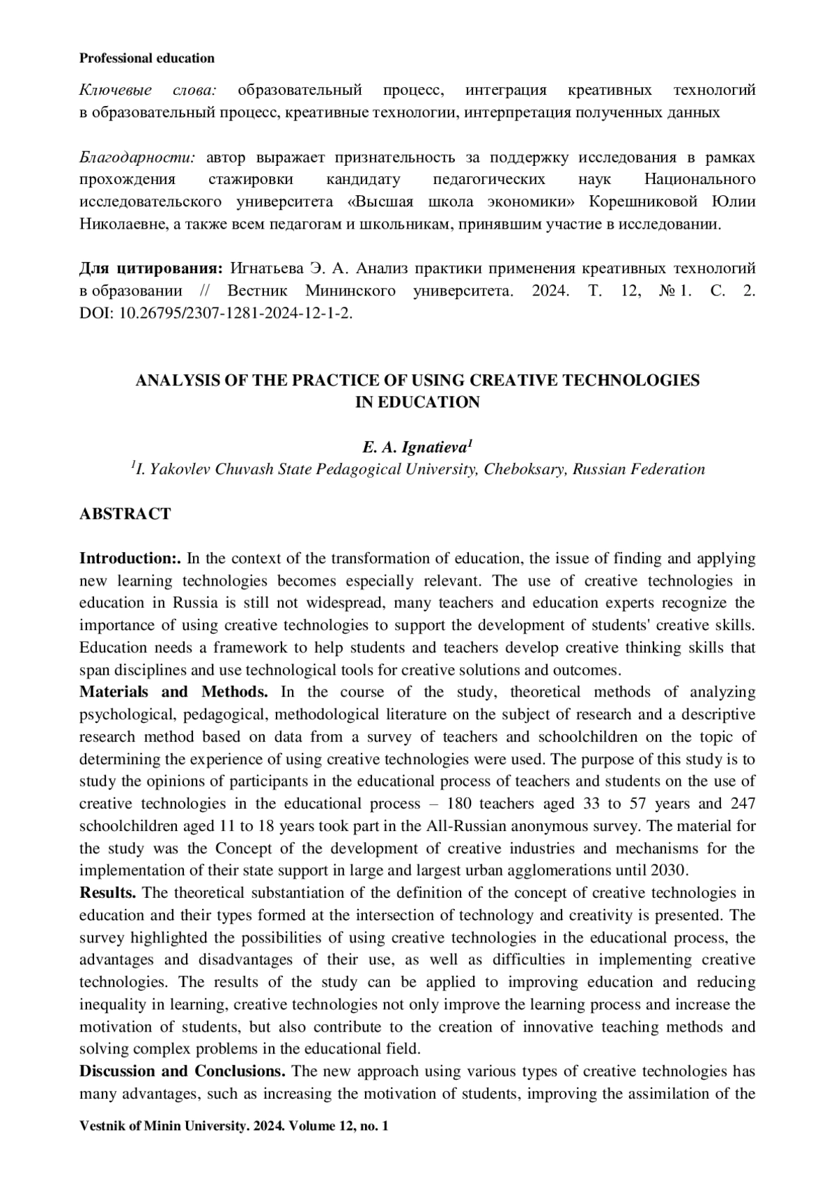 Введение. В условиях трансформации образования вопрос поиска и применения новых технологий обучения становится особенно актуальным. Использование креативных технологий в образовании в России все еще не является широко распространенным явлением, многие учителя и эксперты в области образования признают важность использования креативных технологий для поддержки развития творческих навыков учащихся. Образованию нужна структура, чтобы помочь учащимся и учителям развивать навыки творческого мышления, которые охватывают дисциплины, и использовать технологические инструменты для творческих решений и результатов.