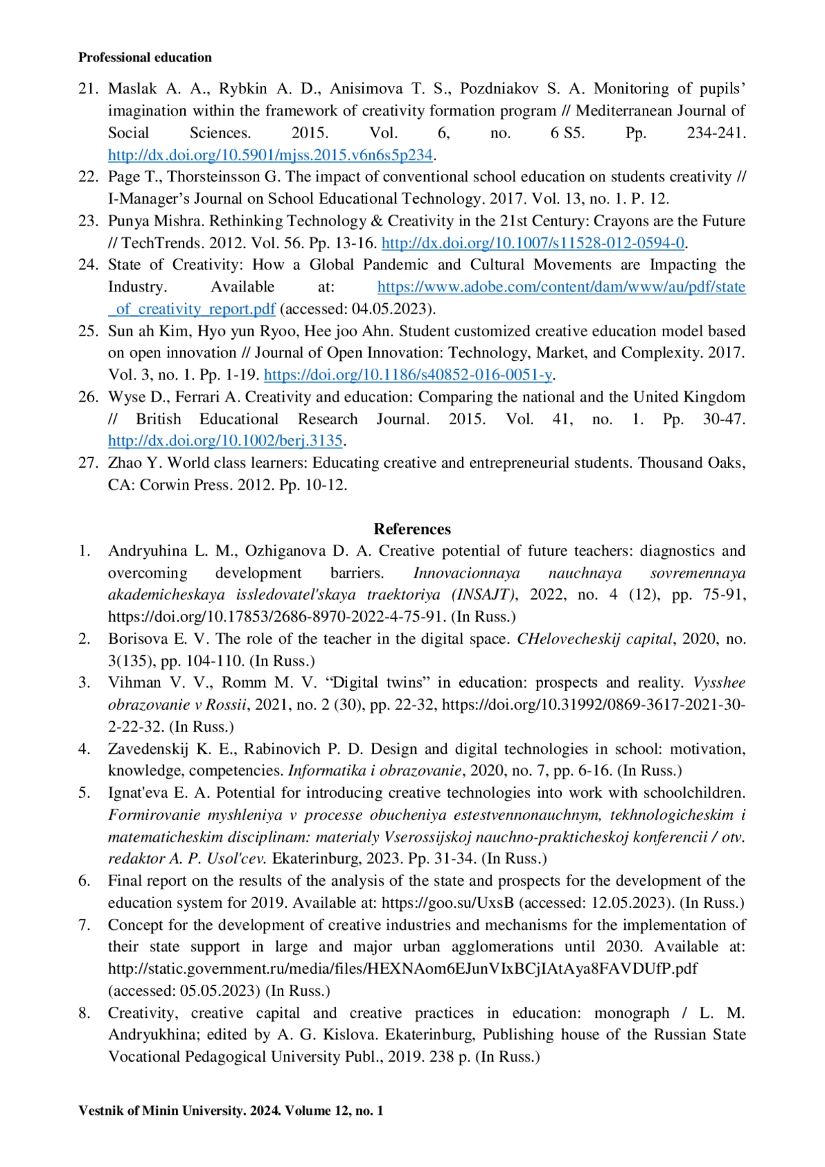 1. Андрюхина Л. М., Ожиганова Д. А. Креативный потенциал будущих педагогов: диагностика и преодоление барьеров развития // Инновационная научная современная академическая исследовательская траектория (ИНСАЙТ). 2022. № 4 (12). С. 75-91. https://doi.org/10.17853/2686-8970-2022-4-75-91.