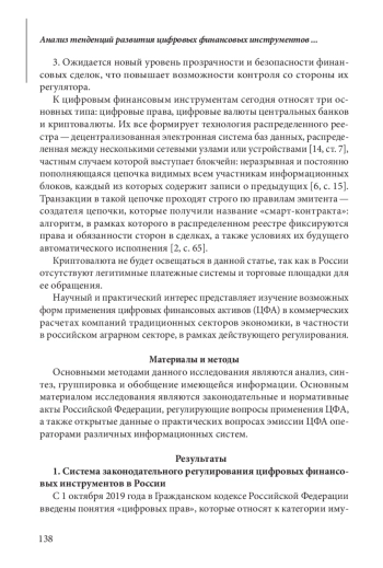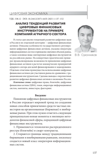 В статье дан анализ тенденций развития цифровых прав в России и их отдельной категории — цифровых финансовых активов. Описаны особенности государственного регулирования цифровых финансовых активов, указаны операторы информационных систем и приведены значения объемов рынка, а также основные виды эмитируемых цифровых инструментов на российском рынке. На конкретных практических примерах проанализированы возможности применения цифровых финансовых активов в расчетах коммерческих предприятий аграрного сектора для целей финансирования и хеджирования. Отдельно отмечены преимущества использования цифровых финансовых активов для участников рынка по сравнению с традиционными инструментами. Сделаны выводы о перспективах развития цифровых финансовых активов в экономике России.
