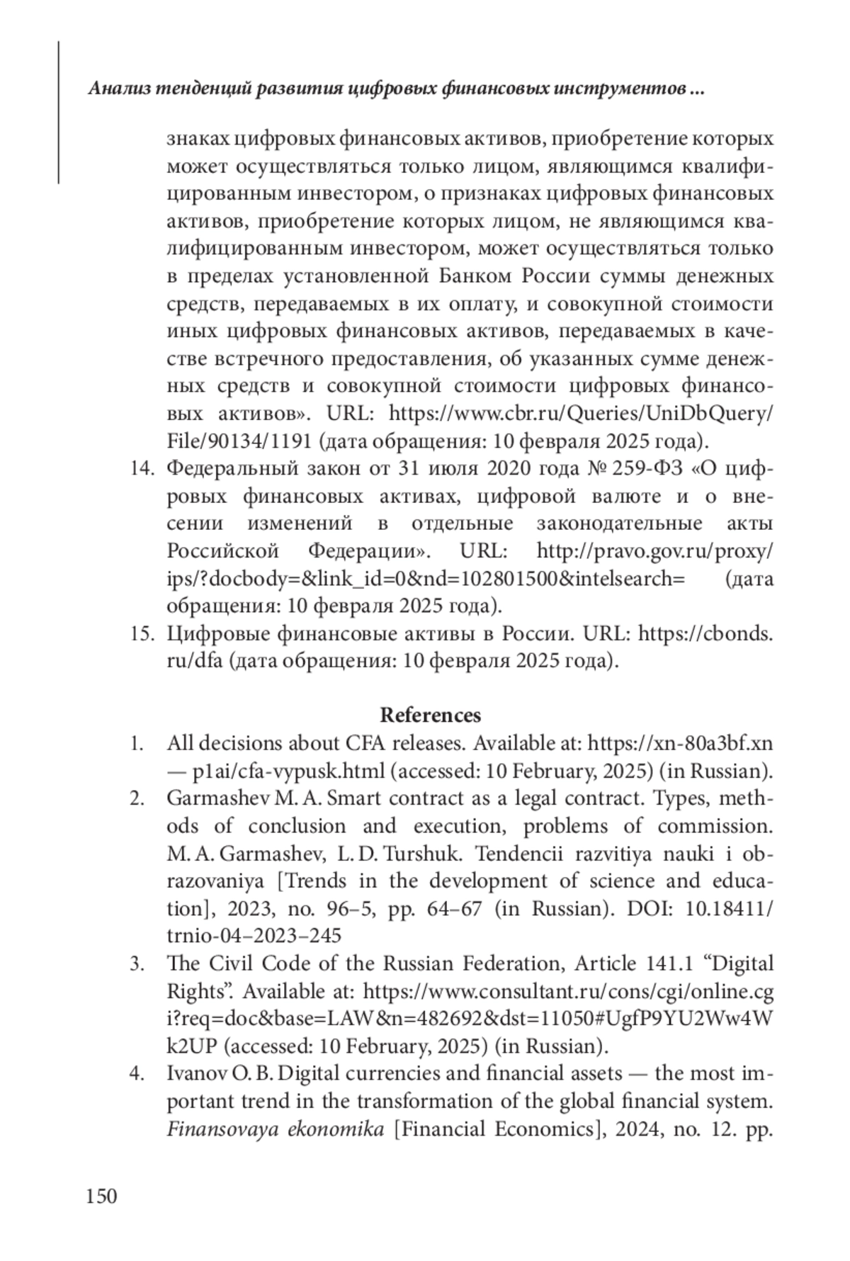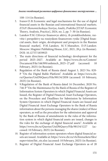 5. 	Иванов О. Б. Экономико-правовые механизмы применения цифровых финансовых активов на российском и международном финансовых рынках // ЭТАП: Экономическая Теория, Анализ, Практика. 2024. № 2. С. 7-30.