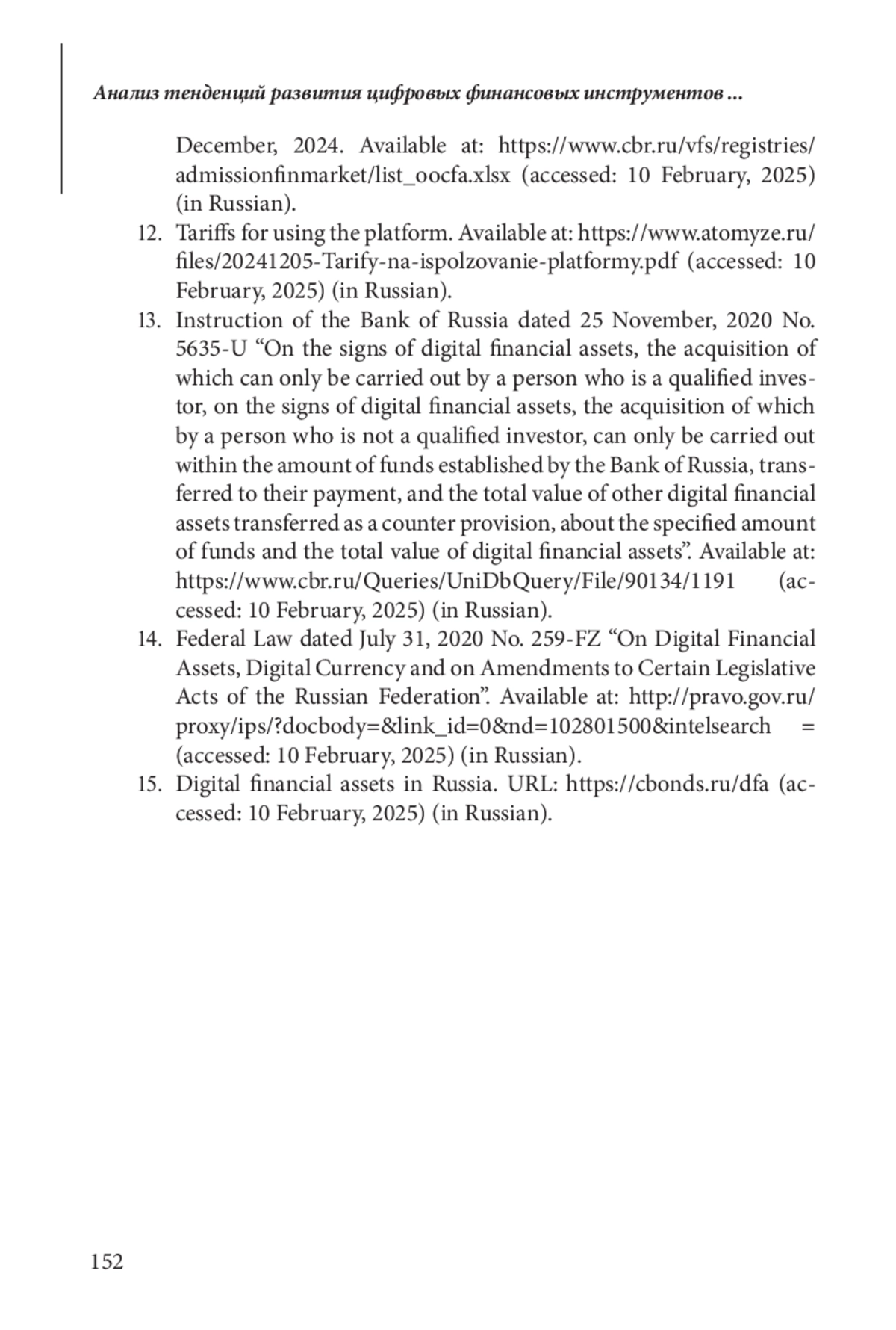 15. 	Цифровые финансовые активы в России. URL: https://cbonds.ru/dfa (дата обращения: 10 февраля 2025 года).