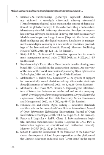 10. 	Николаев Д. Е. и др. Цифровая железная дорога - инновационные стандарты и их роль на примере Великобритании // International Journal of Open Information Technologies. 2016. Т. 4. № 10. С. 55-61.