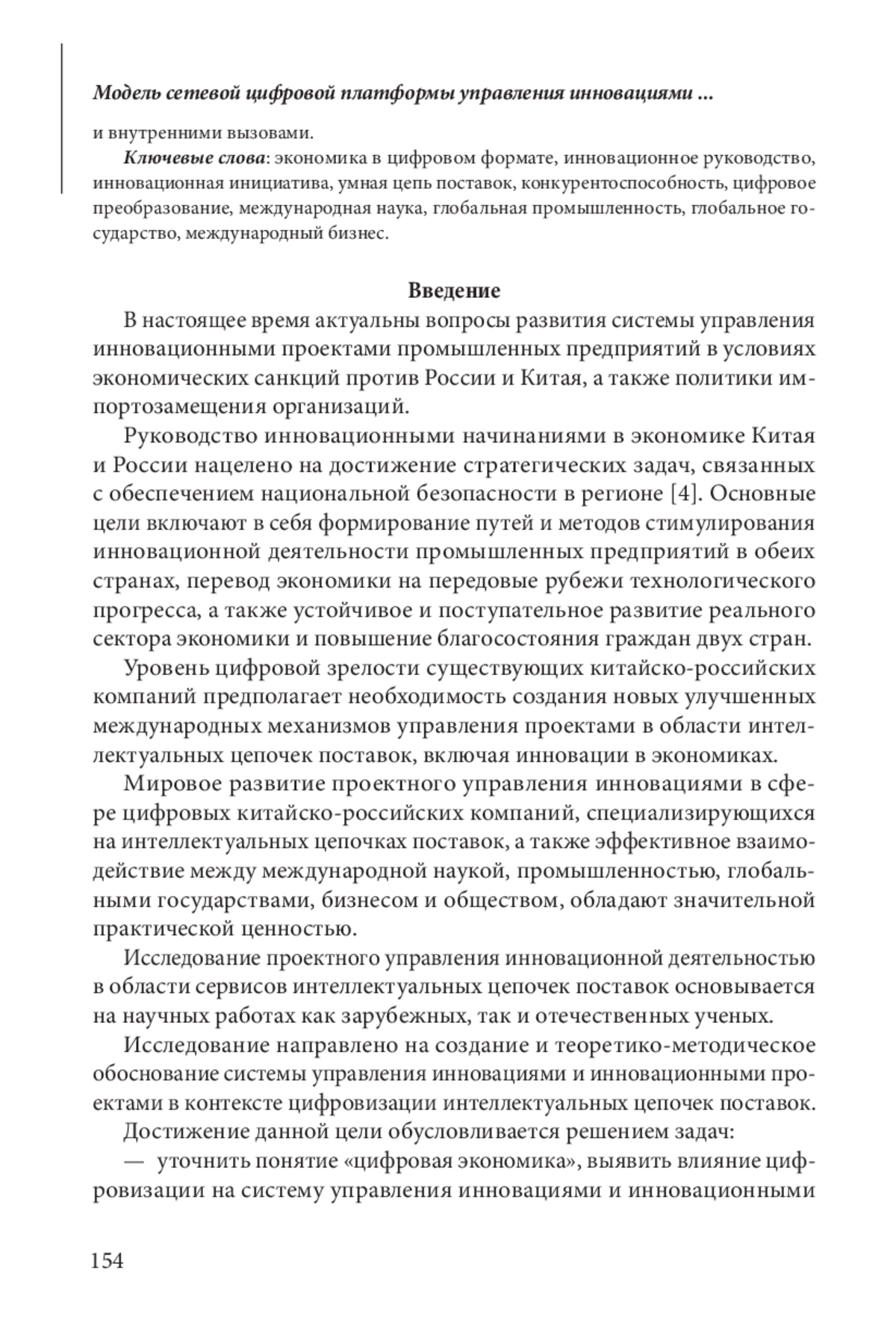 Мировая экономика переживает интеллектуальную цифровизацию, спровоцированную быстрым прогрессом в области информационно-коммуникационных технологий, что порождает значительные вызовы и в то же время открывает новые перспективы для инновационной деятельности в китайско-российских компаниях. В эпоху глобальной цифровой трансформации, особенно в свете усиления экономических санкций из Европы и США [3] и потребности в осуществлении политики импортозамещения, становление эффективной системы управления инновационными проектами в сфере сервисов интеллектуальных цепочек поставок становится чрезвычайно актуальным для экономики Китая и России.