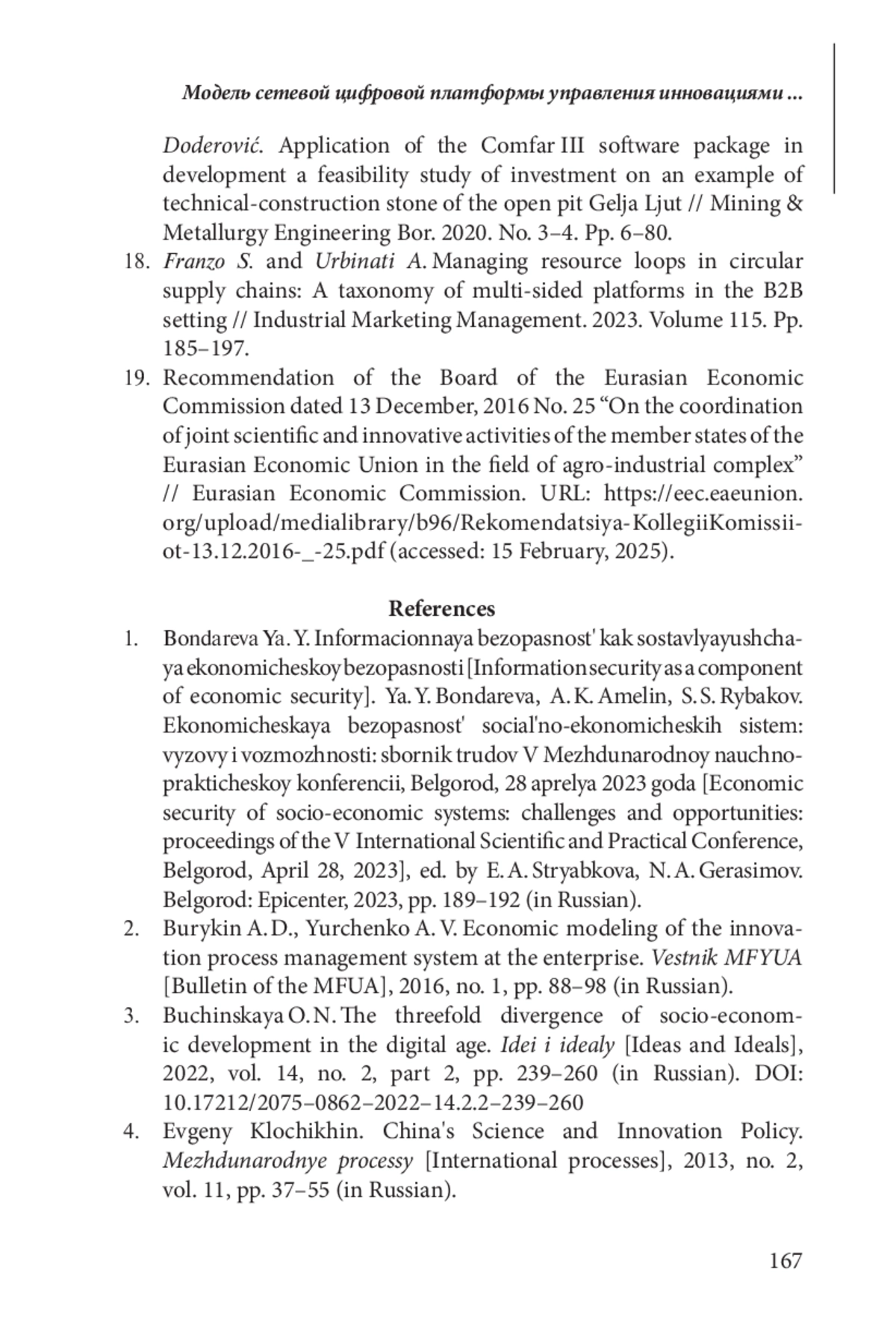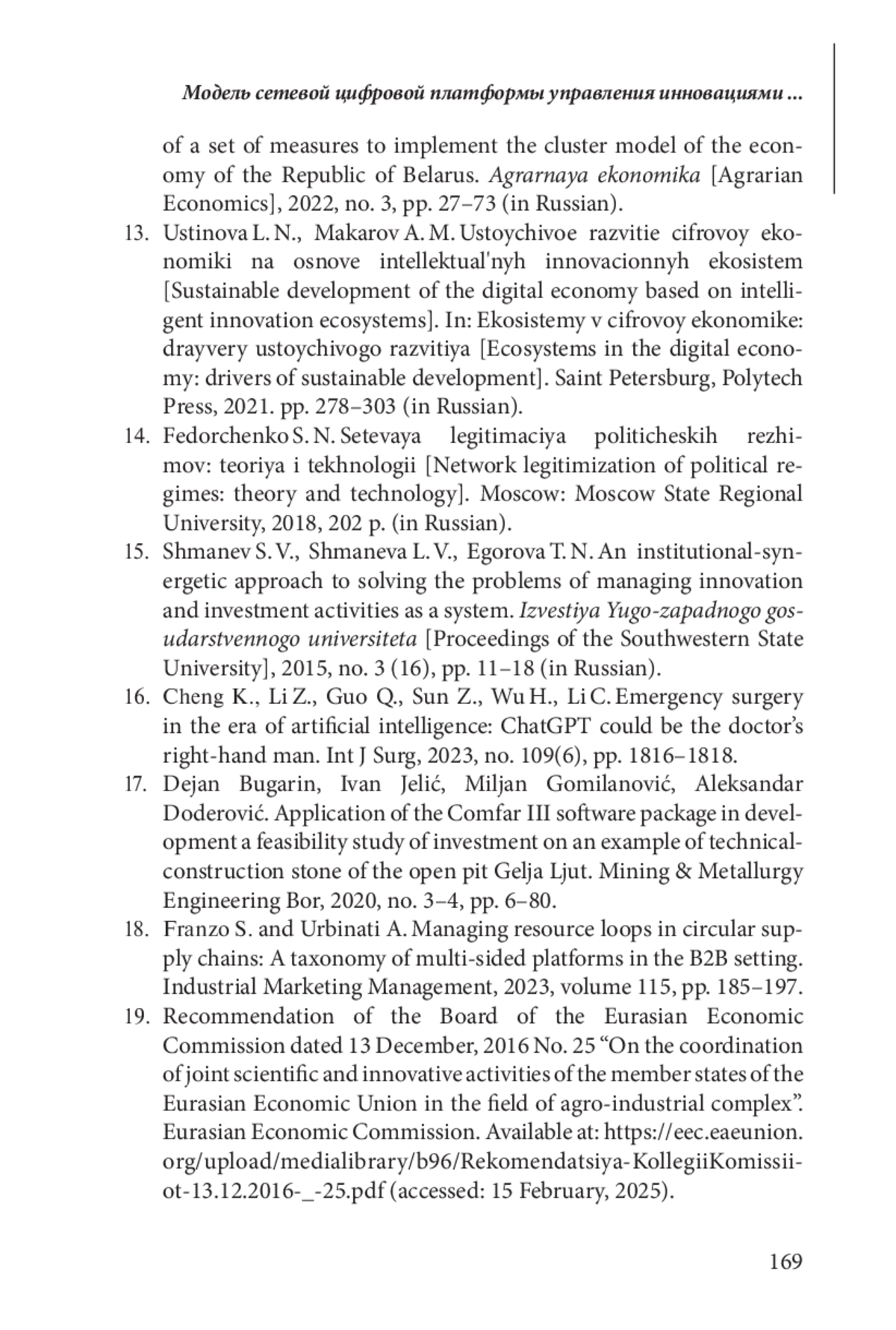 19. 	Recommendation of the Board of the Eurasian Economic Commission dated 13 December, 2016 No. 25 “On the coordination ofjoint scientific and innovative activities of the member states of the Eurasian Economic Union in the field of agro-industrial complex” // Eurasian Economic Commission. URL: https://eec.eaeunion.org/upload/medialibrary/b96/Rekomendatsiya-KollegiiKomissii-ot-13.12.2016-_-25.pdf (accessed: 15 February, 2025).