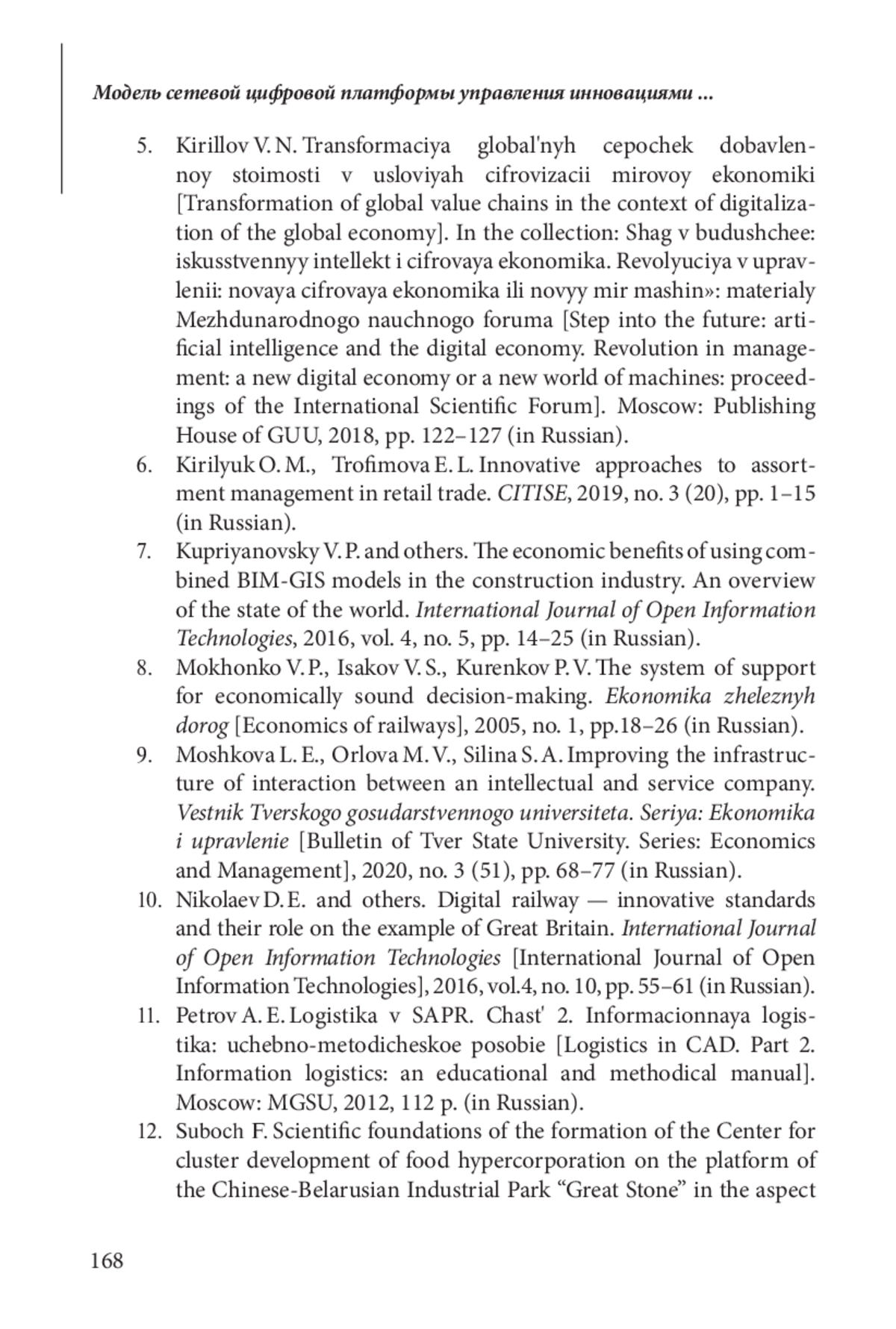 5. 	Кириллов В. Н. Трансформация глобальных цепочек добавленной стоимости в условиях цифровизации мировой экономики // В сб.: “Шаг в будущее: искусственный интеллект и цифровая экономика. Революция в управлении: новая цифровая экономика или новый мир машин”: материалы Международного научного форума. М.: Изд. дом ГУУ, 2018. С. 122-127.